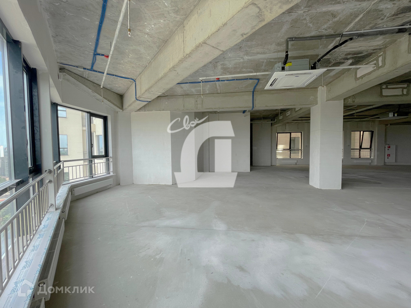 -Справа от холла вход в огромное помещение свободной планировки с двумя с/у, выходом на просторный балкон и витражным остеклением, с потрясающим видом на город и атриум здания.
