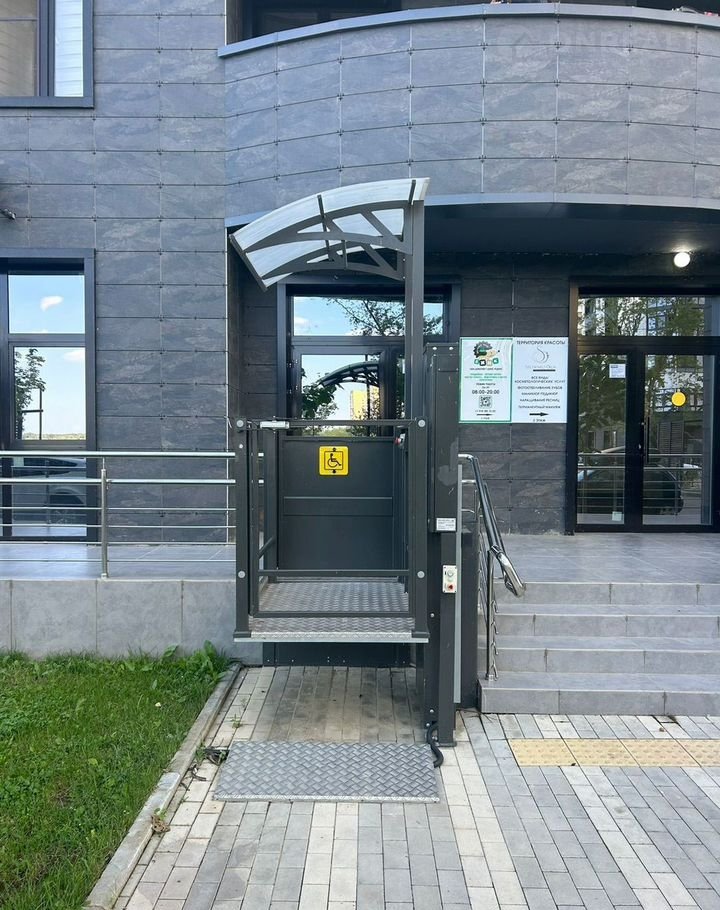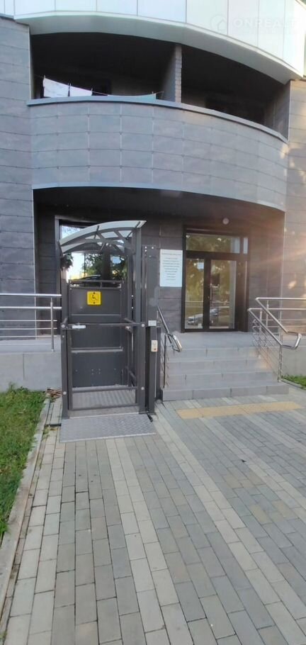 Два входа, панорамные витражные окна.