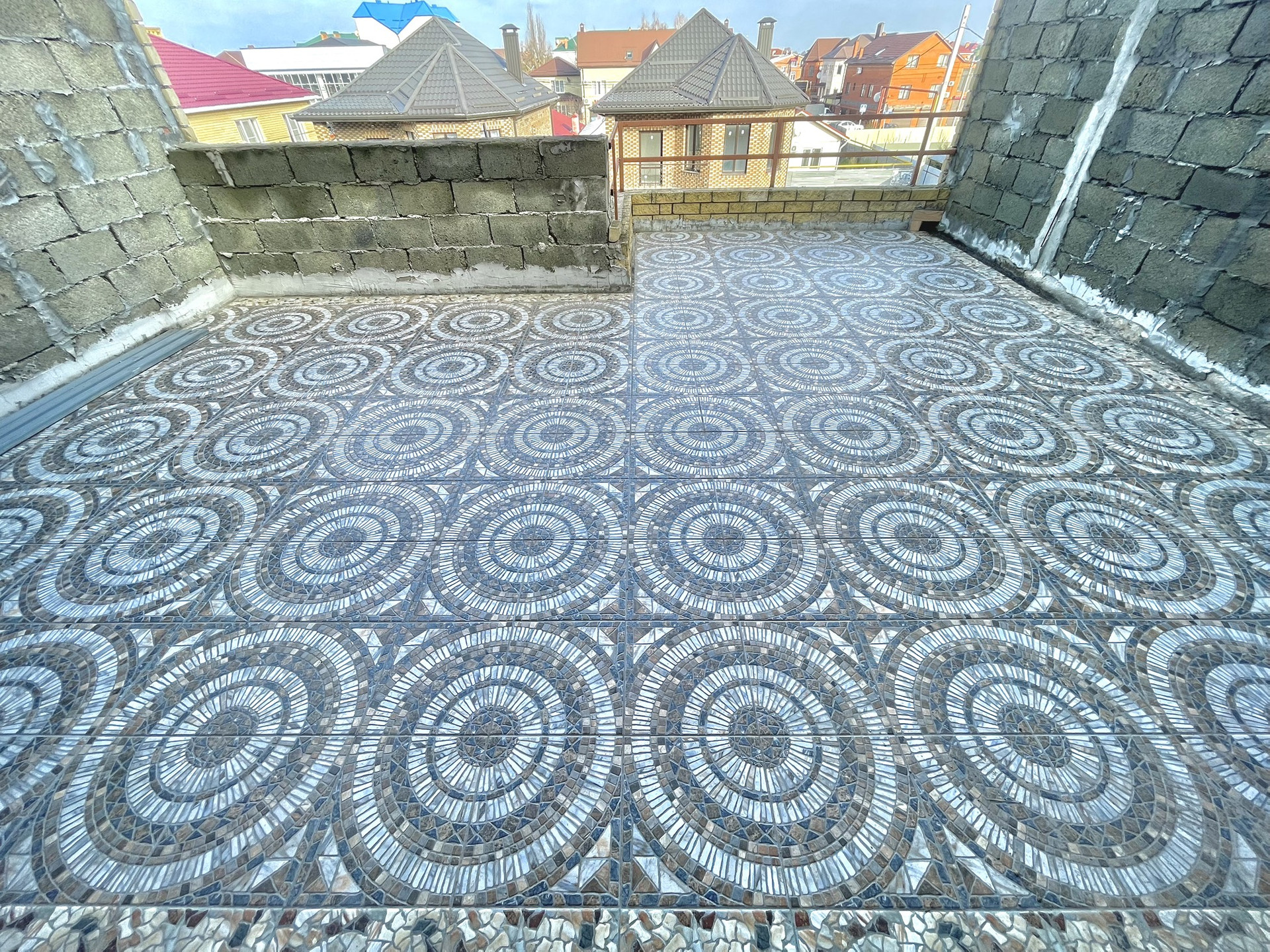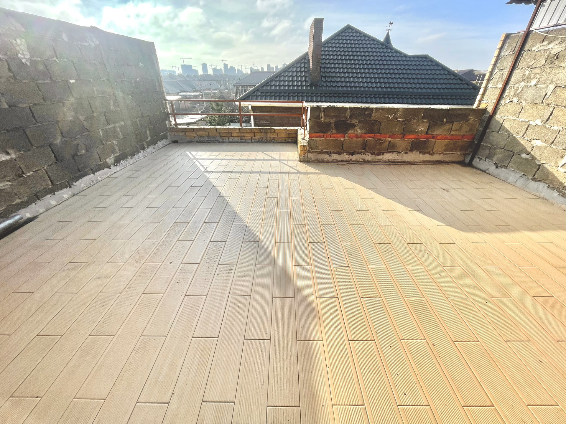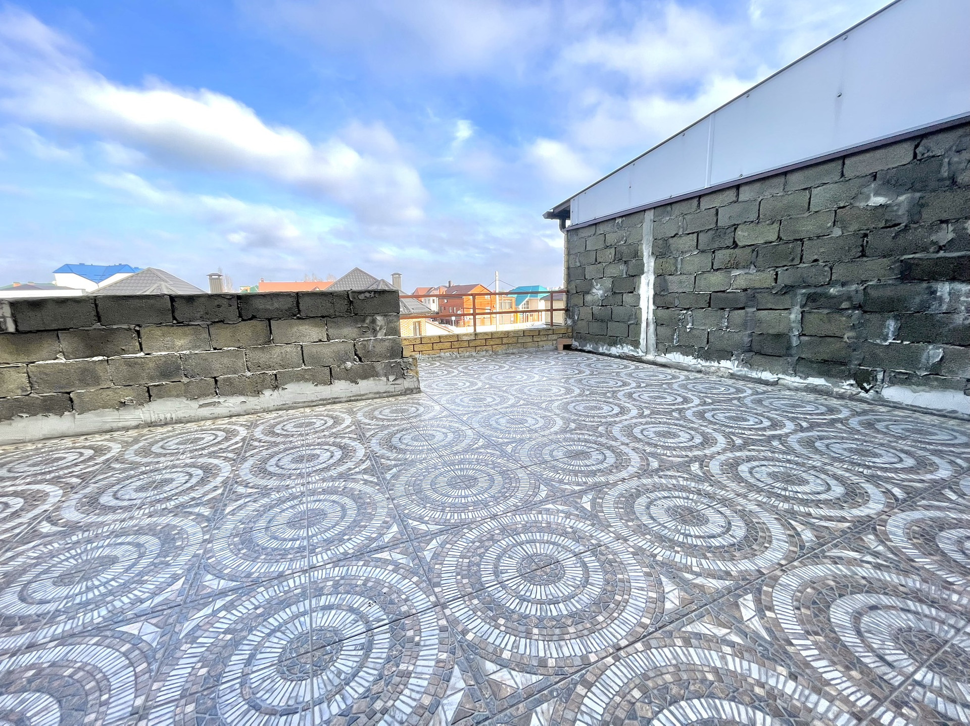 Потолок спален 2-го этажа - монолитный. Утеплен техноплексом, паро- и гидро-изолирован. Крыша террас - керамогранитная плитка.