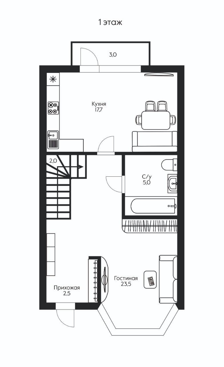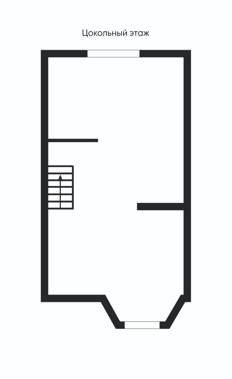 Планировка : цокольный этаж свободной планировки. На первом этаже гостиная , сан.узел и кухня - столовая . На втором этаже две просторные спальни и сан.узел.