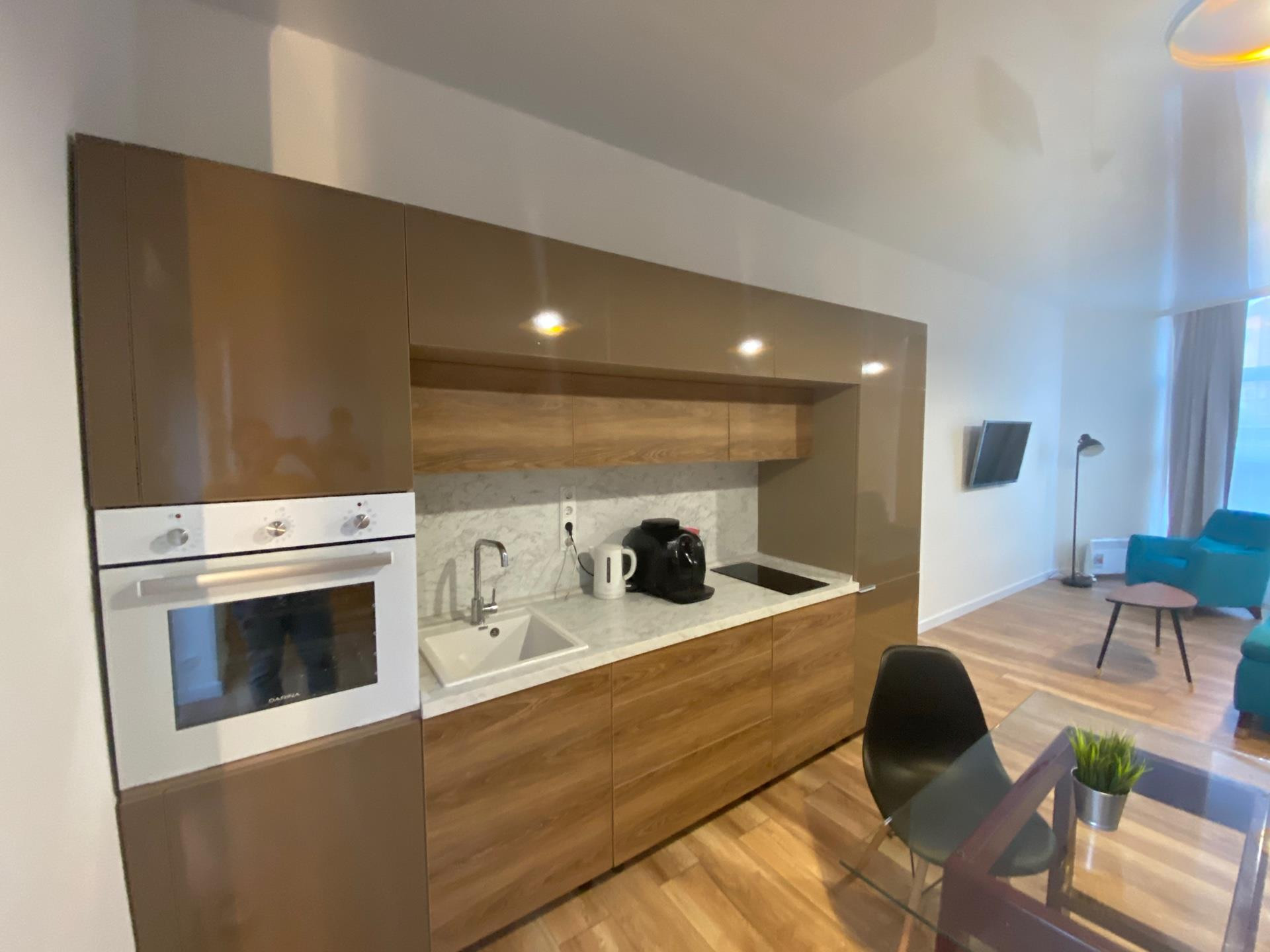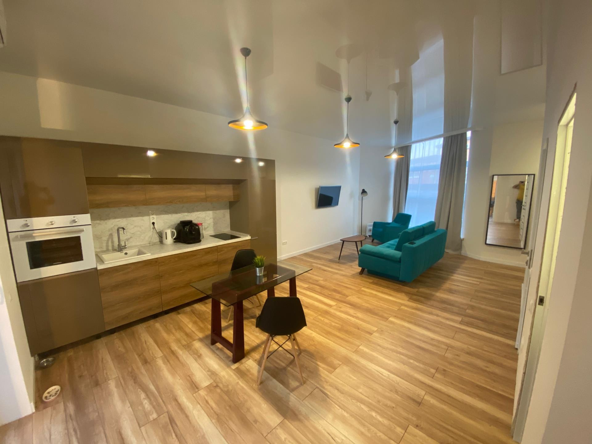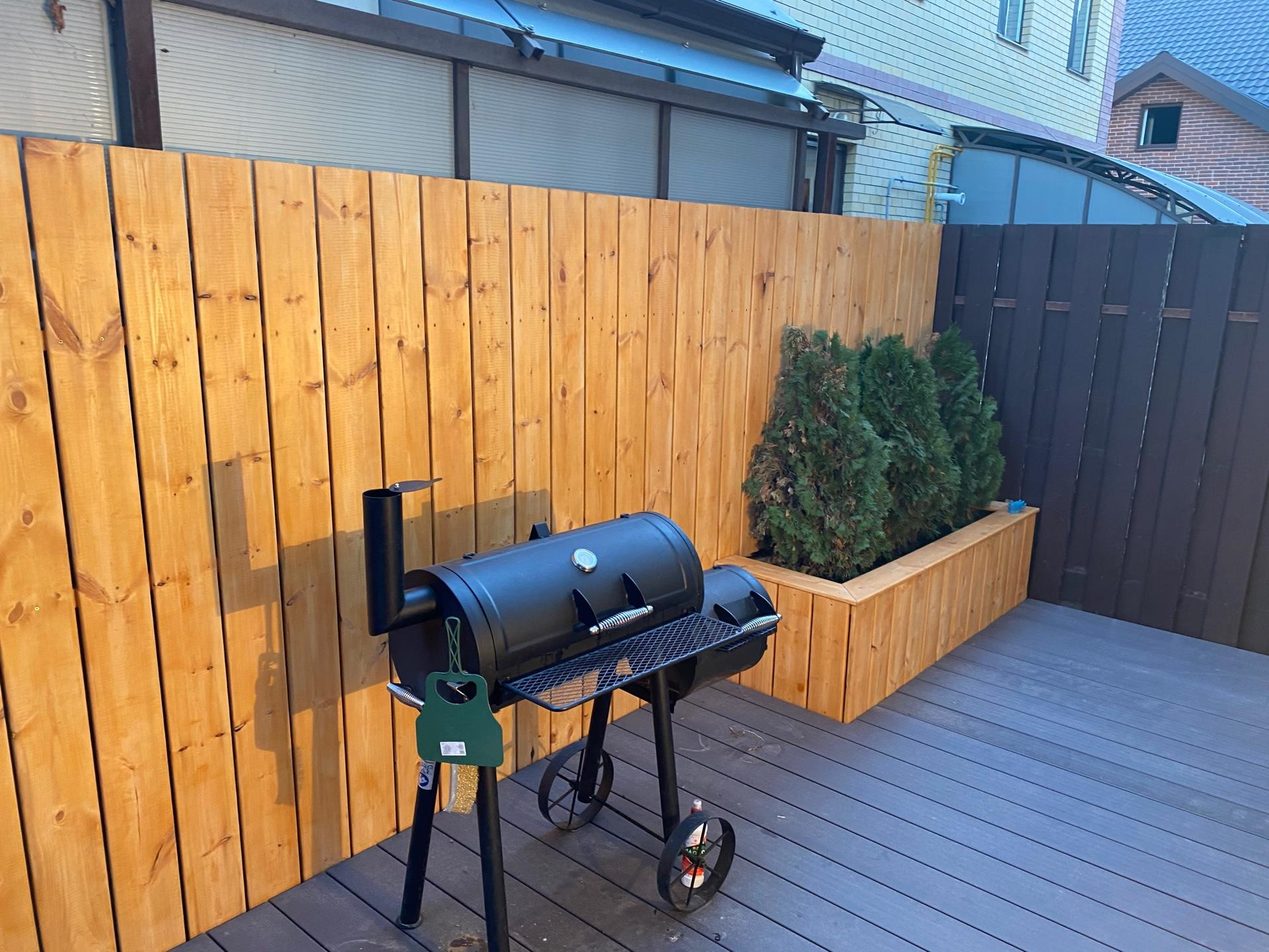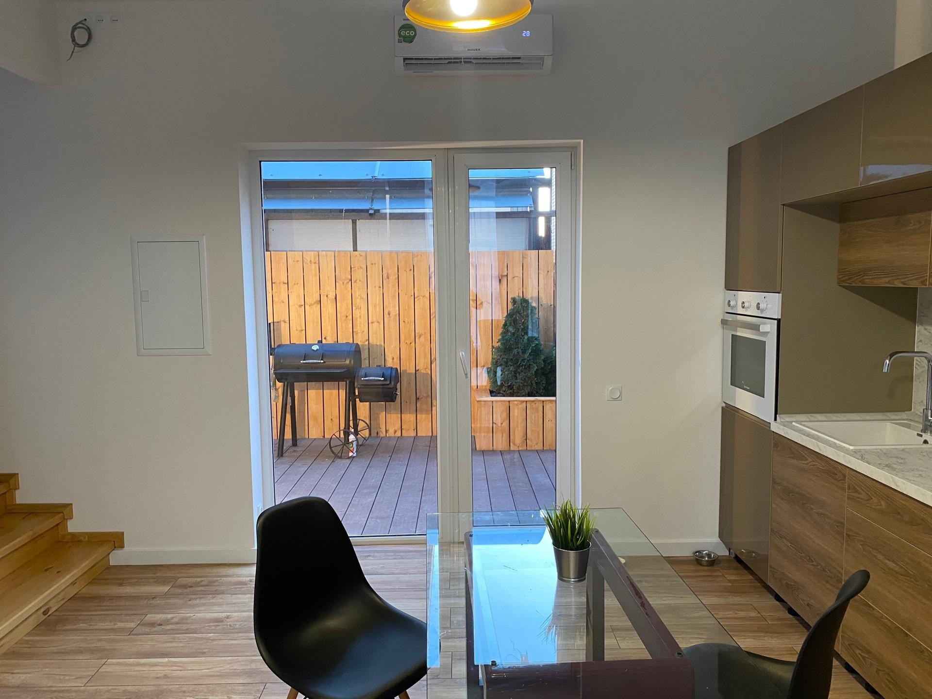 1 этаж: Прихожая с вместительным встроенным шкафом, гостиная с кухней со встроенной техникой и встроенным холодильником, выход на террасу. Террасная доска POLYWOOD, высажены зелёные насаждения.
