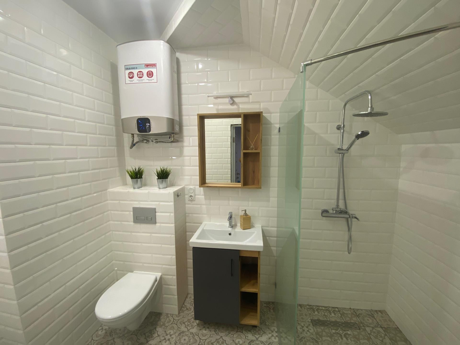 Кладовая под лестницей со стиральной машиной. На этаже просторный Сан.узел с душевой. Установлен инвентарный кондиционер.