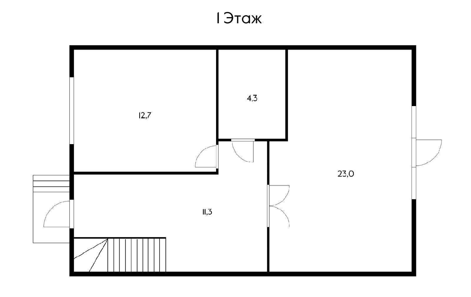 На первом этаже большая кухня-гостиная и гостевая комната, сан.узел.