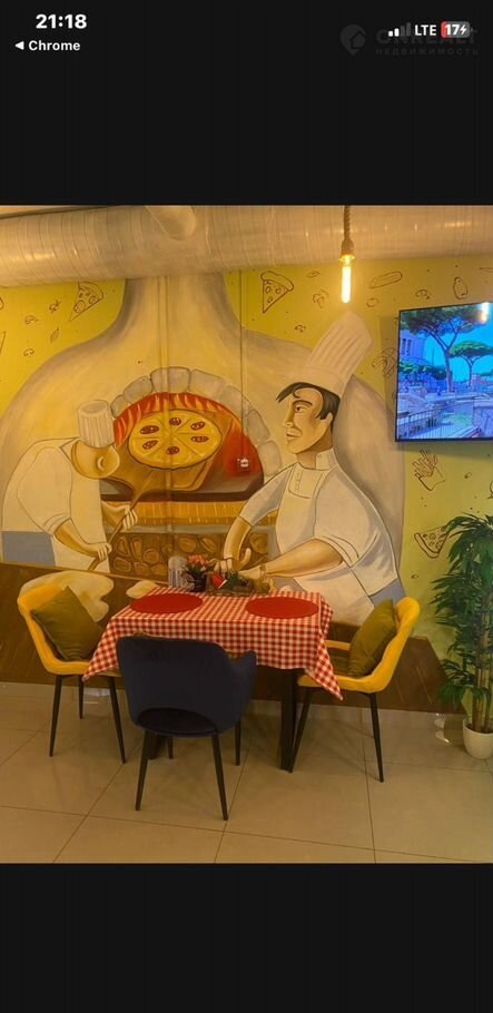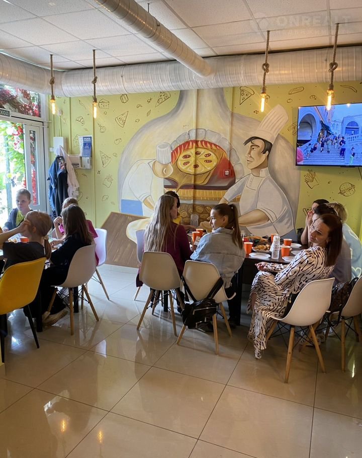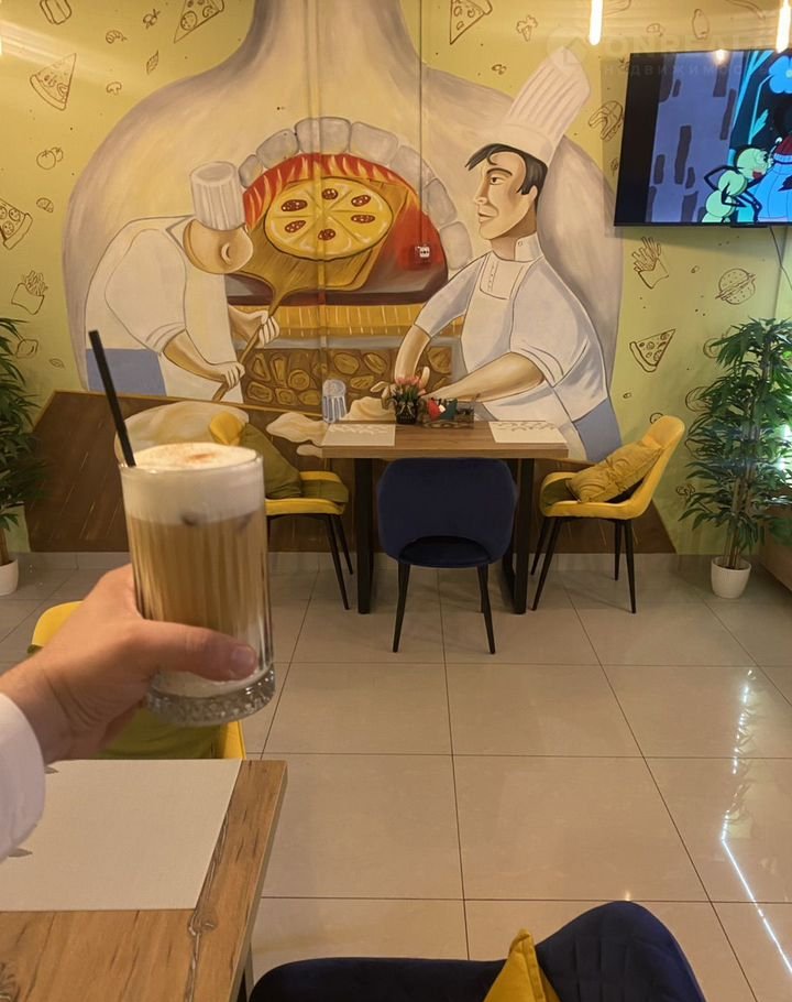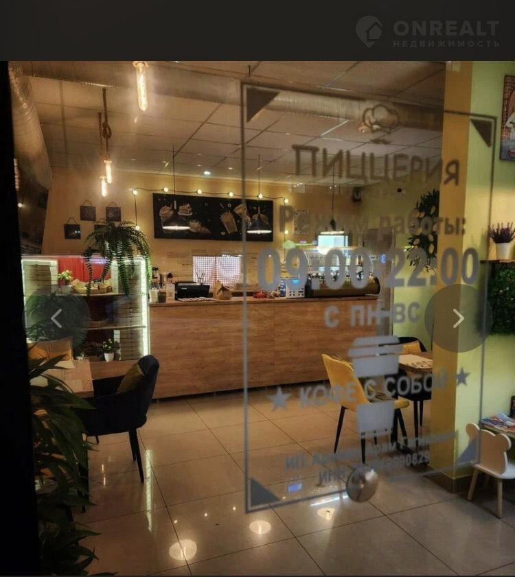 Зал : барная стойка, стойка бариста, витрина для пиццы, с подсветкой, витрина настольная холодильная для напитков и салатов, мебель- удобные кресла /стул из моющего материала качественные столы,, ( общее колличество посадки 14) чел . плазменный телевизор, декоративные деревья, сплит система, роs Система (fusiоn) Кассовое оборудование очень приятное освещение зала и бара.