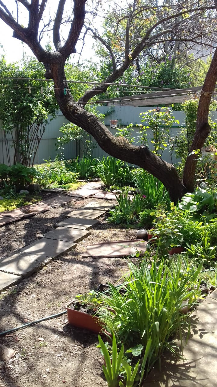 3) Задний двор представляет собой сад, на котором помимо цветов растет абрикоса, виноград, малина, черная смородина. Есть возможность сделать летнюю беседку с очень красивым местом для отдыха в тишине на свежем воздухе.