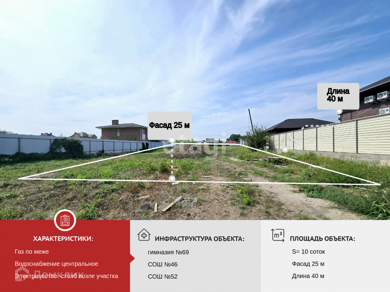 Территория ДНТ закрытая . Рядом ЖК Фреш с набережной у р. Кубань, гимназия №69, СОШ №46,52. А также супермаркеты,аптеки, магазины в шаговой доступности в жилых комплексах по соседству.