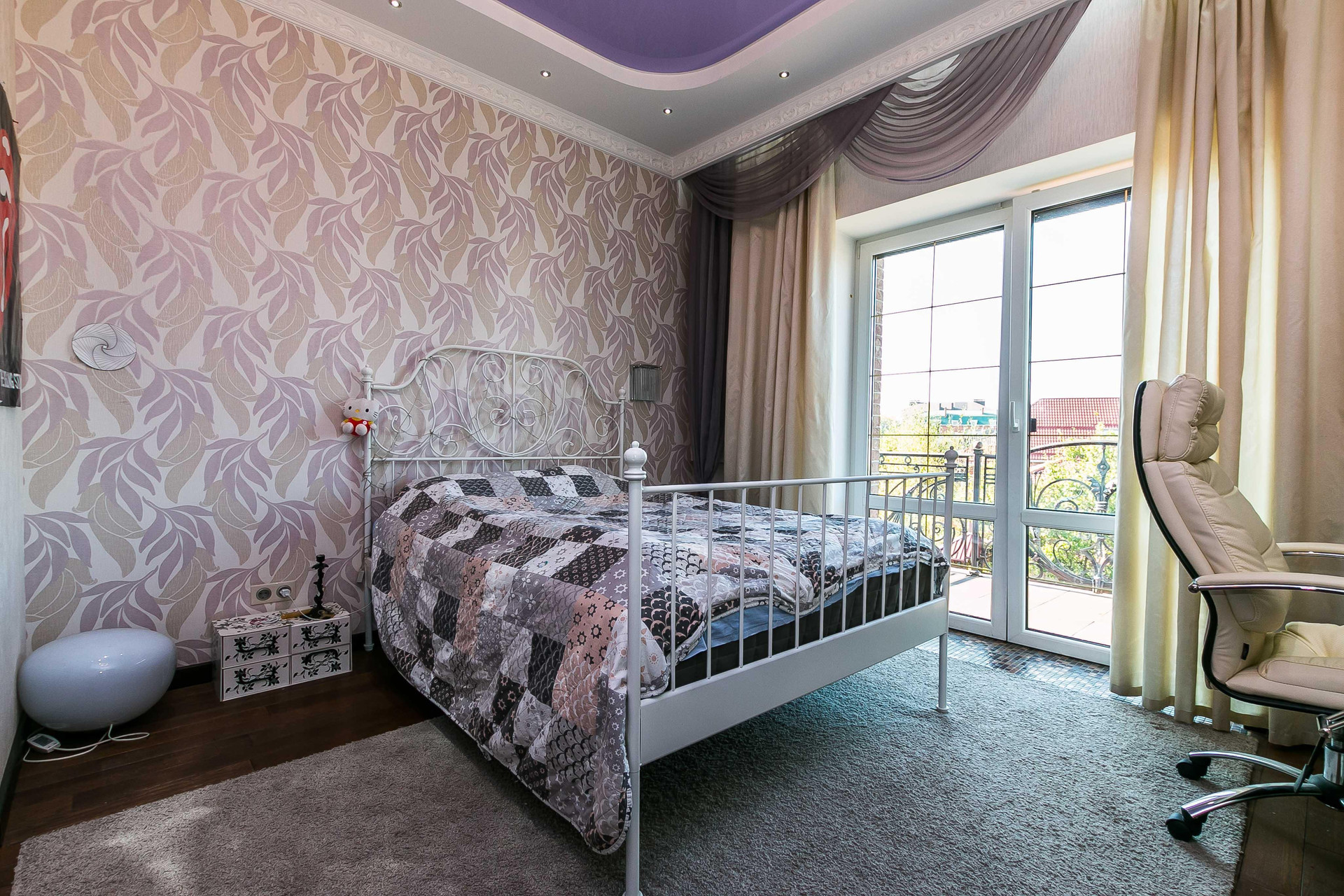 В доме раздельно располагаются жилая зона и зона отдыха. На первом этаже расположен кабинет, кухня-столовая, гостиная комната с камином, ванная, санузел, на полу дорогой травертин, столешницы и подоконники из мрамора, все окна Rehau. На полуторном этаже две спальных комнаты. Второй этаж: четыре спальни с гардеробными, в родительской комнате своя ванна и с/у. Везде тёплые полы, элитная мебель из натуральных пород дерева, дорогая бытовая техника, система охраны. Весь дом оснащен кондиционерами, двойная система вентиляции и отопления.