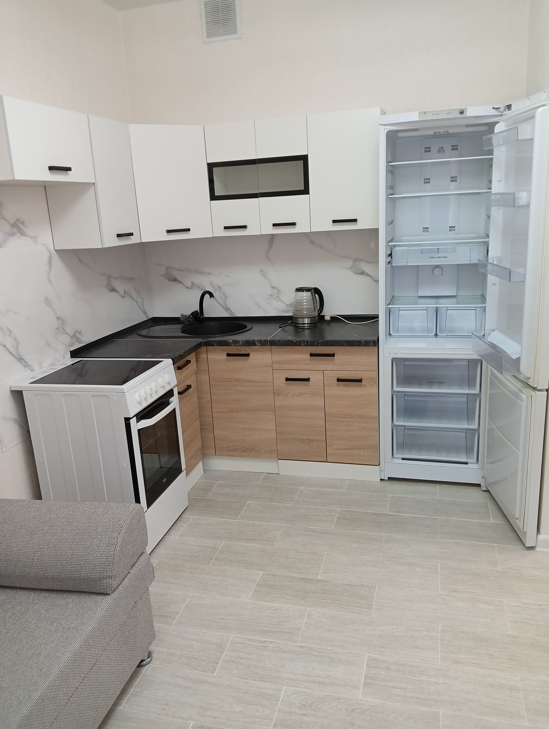 Из мебели: кровать, диван, шкаф, комод, гардероб. Из техники: стиральная машина, плита с духовым шкафом, холодильник, телевизор, чайник.