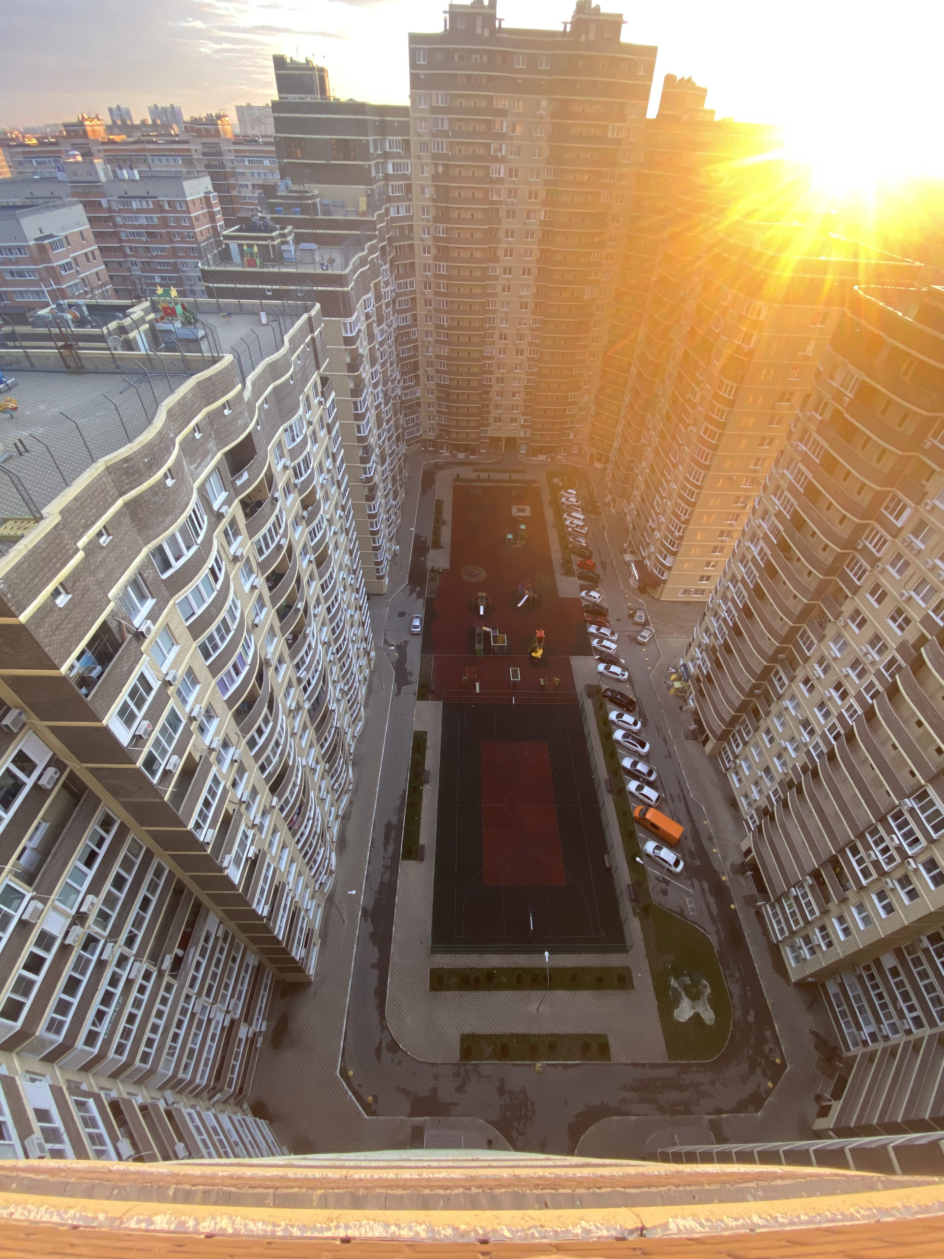 Во дворе детские площадки, баскетбольная площадка, зоны отдыха, стол для пинг-понга.