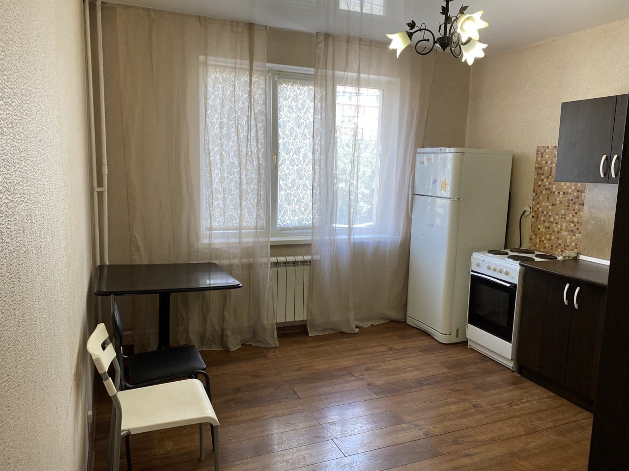 С мебелью, кухней, холодильник,  стиральная машинка,  ванна в кафеле, ламинат, натяжные потолки, интернет. Сплит установят. Все как на фото.