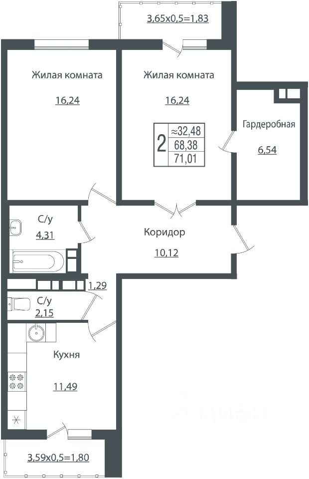 Балкон, лоджия 2 балкона