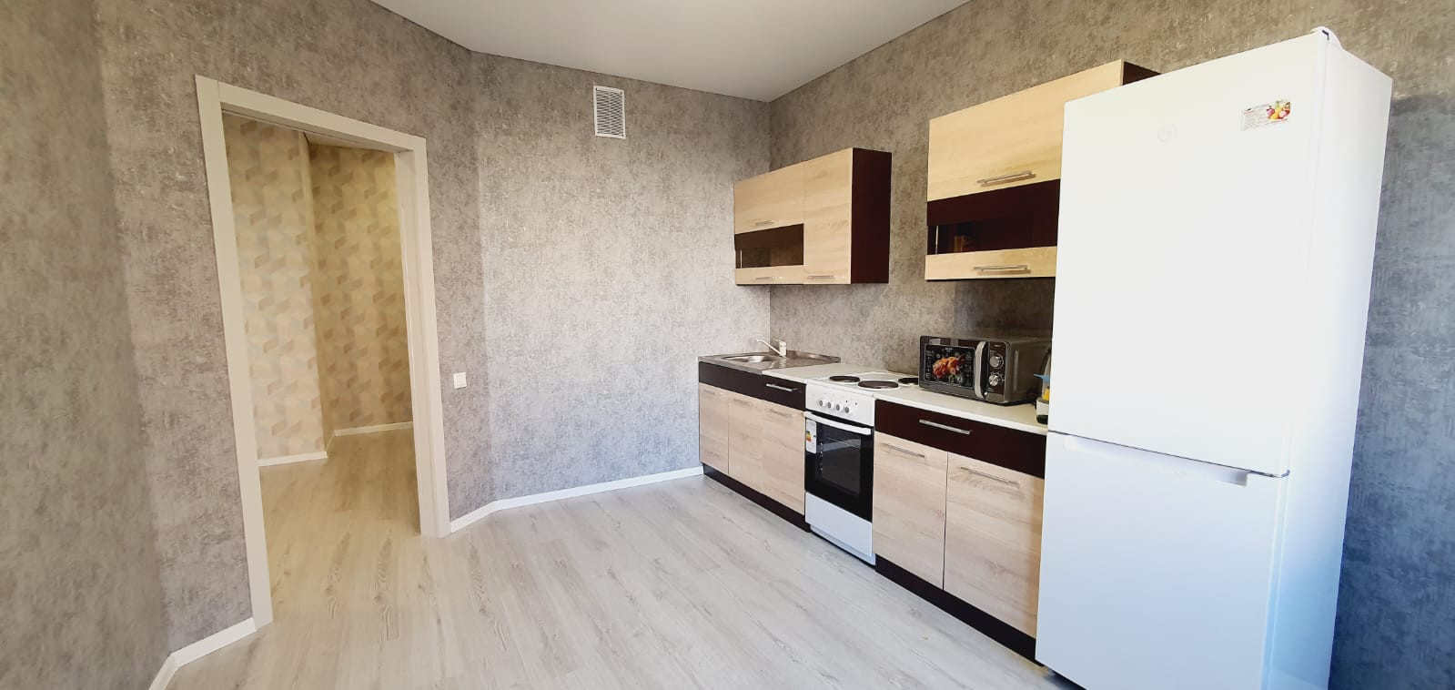 Мебель и техника: холодильник, стиральная машина, микроволновая печь, электрический чайник, плита, телевизор.
