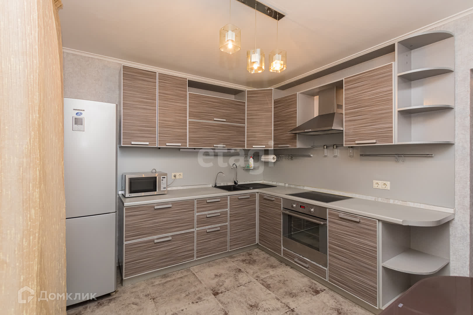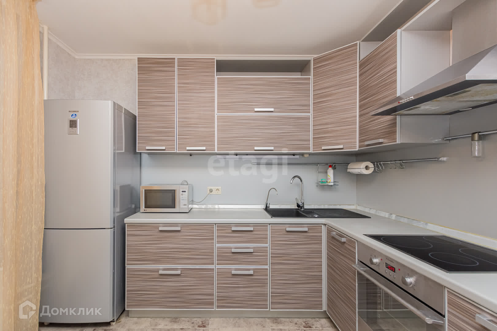 Холодильник,электроплита , микроволновка,вытяжка,фильтр для воды, кухонный гарнитур построен максимально практично и удобно для хранения что позволяет делать как можно меньше лишних движений при приготовлении еды , дополнительная подсветка столешницы для уютного и комфортного досуга в кругу семьи или приготовления блюд.