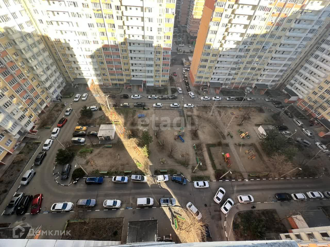 Территория парковки личного транспорта и детской площадки во дворе дома.