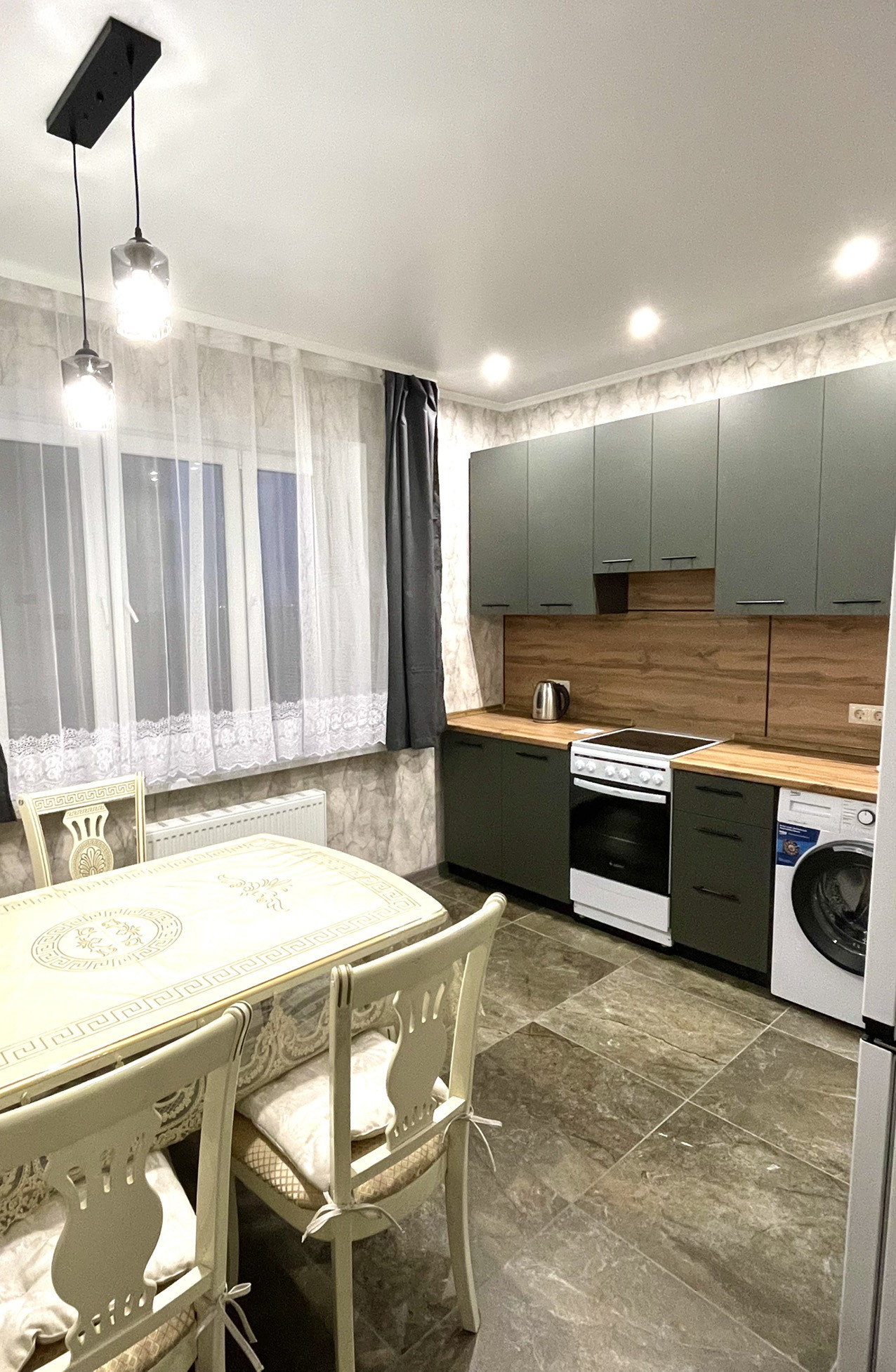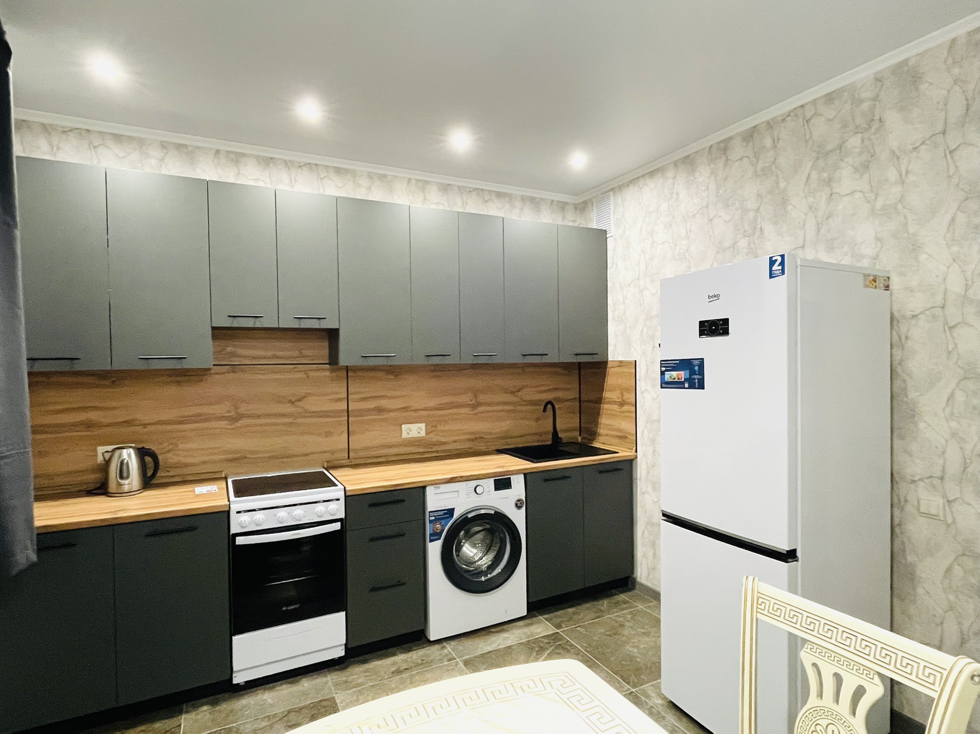 В квартире сделан качественный, дорогостоящий ремонт, установлены 2 сплит системы. Кухня оборудована всей необходимой бытовой техникой, включая холодильник, стекло-керамическую плиту с духовкой, электрочайник, стиральную машину, сушилку для белья.