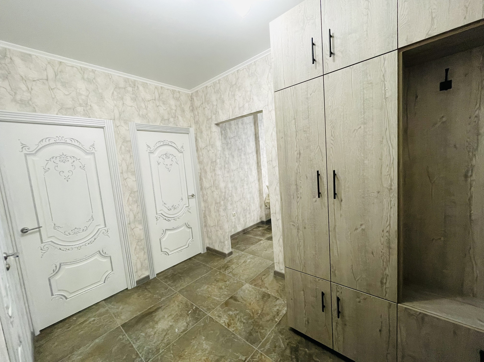 Квартира полностью укомплектована новой мебелью. В спальный гарнитур входит кровать с ортопедическим матрасом, гардеробный шкаф и прикроватные тумбочки. В гостиной установлена модульная стенка с полками, шкафами и стеллажом, угловой диван, раскладное кресло, журнальный столик и телевизор.