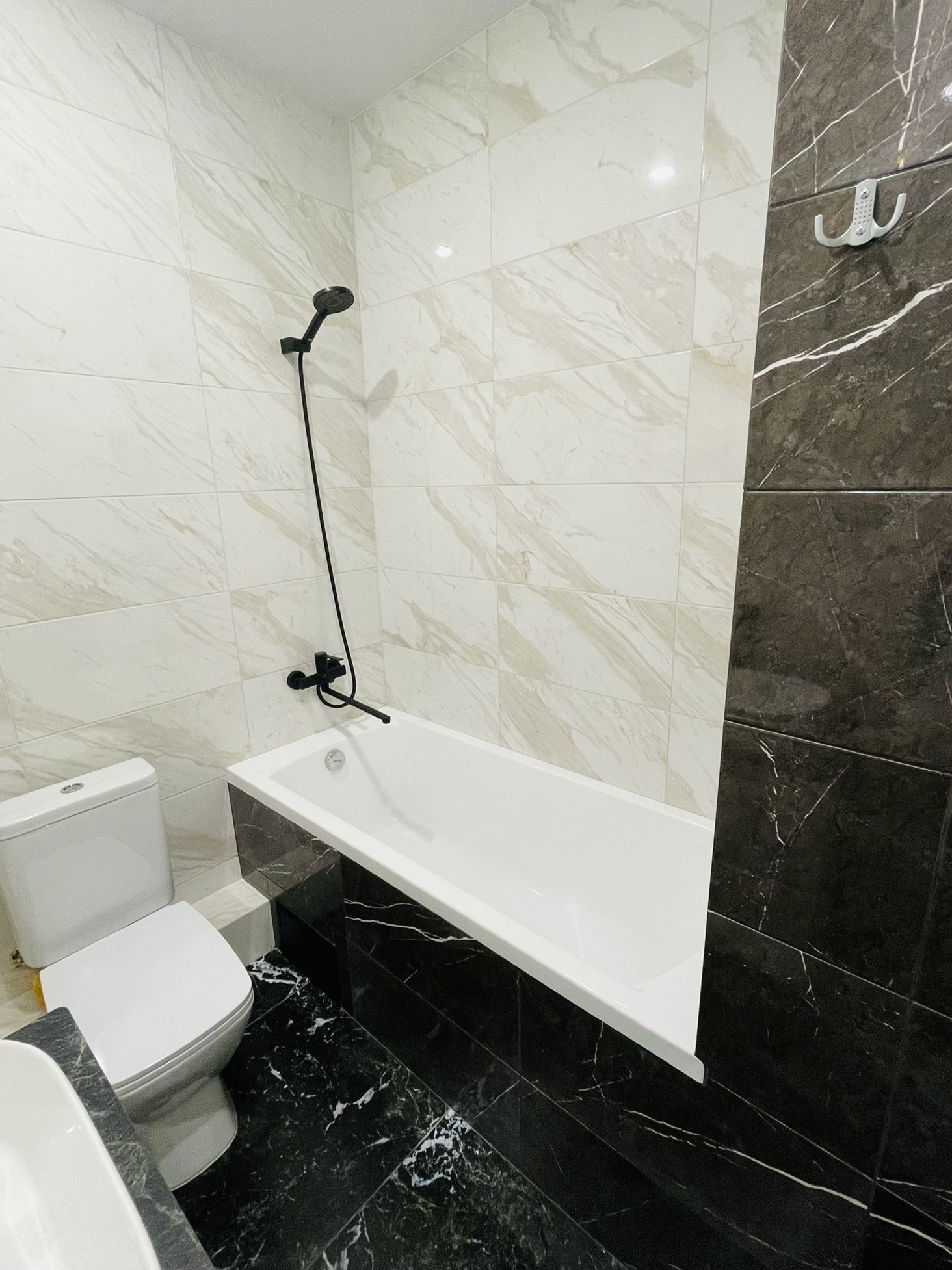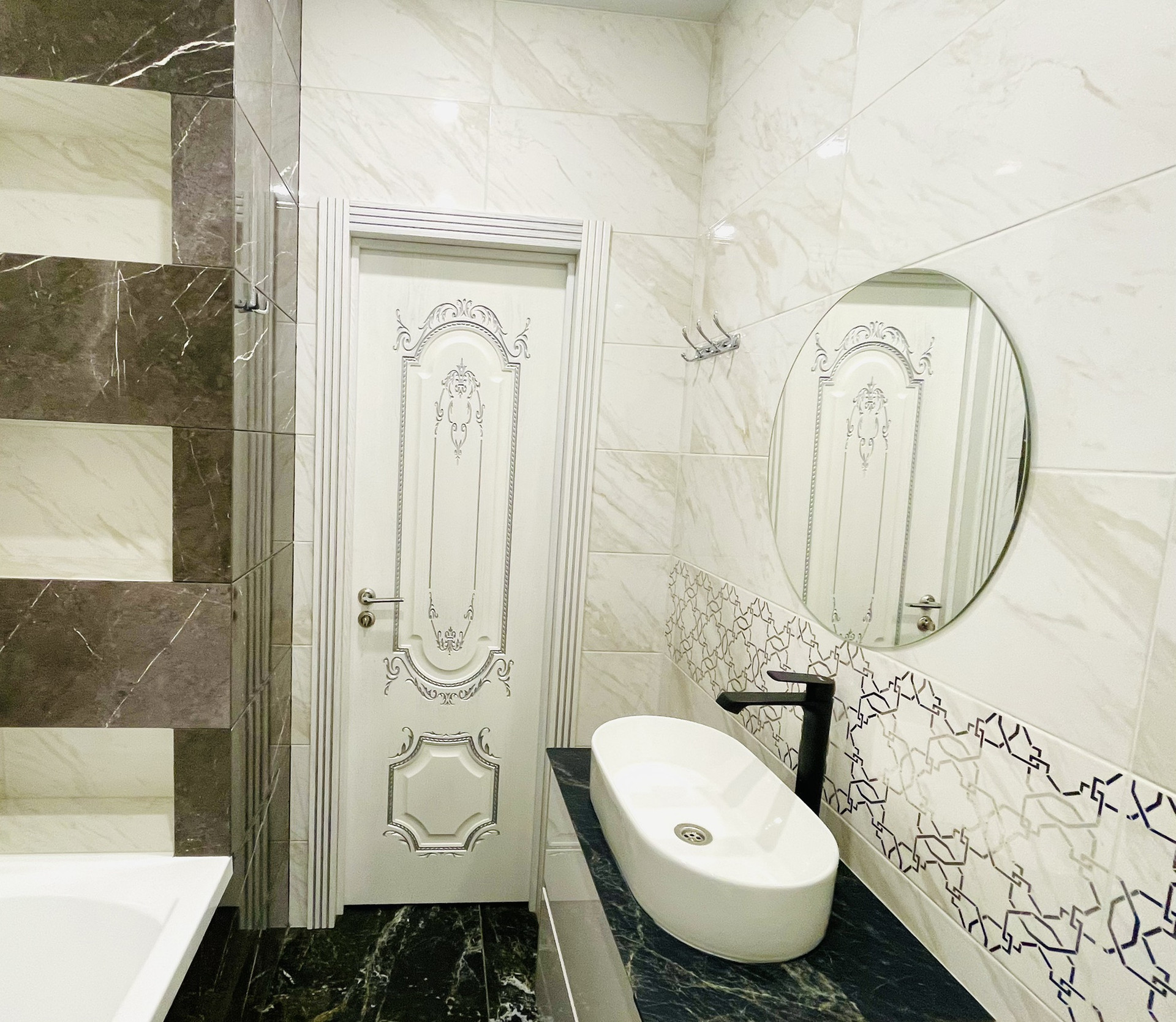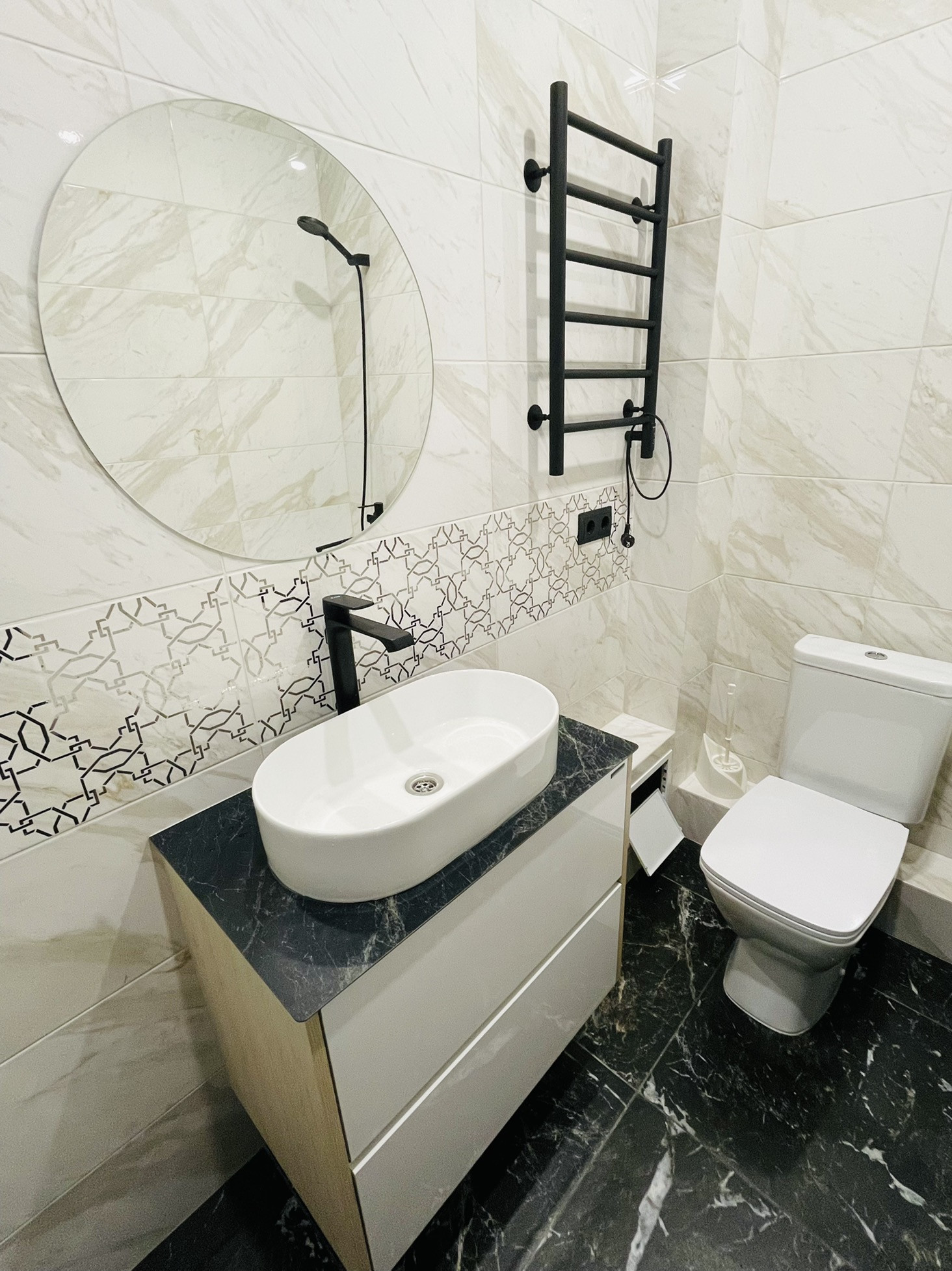 В квартире ванная комната совмещена с сан. узлом. На стене электрический полотенцесушитель, подвесная тумба с раковиной-чашей и полноценная ванная.