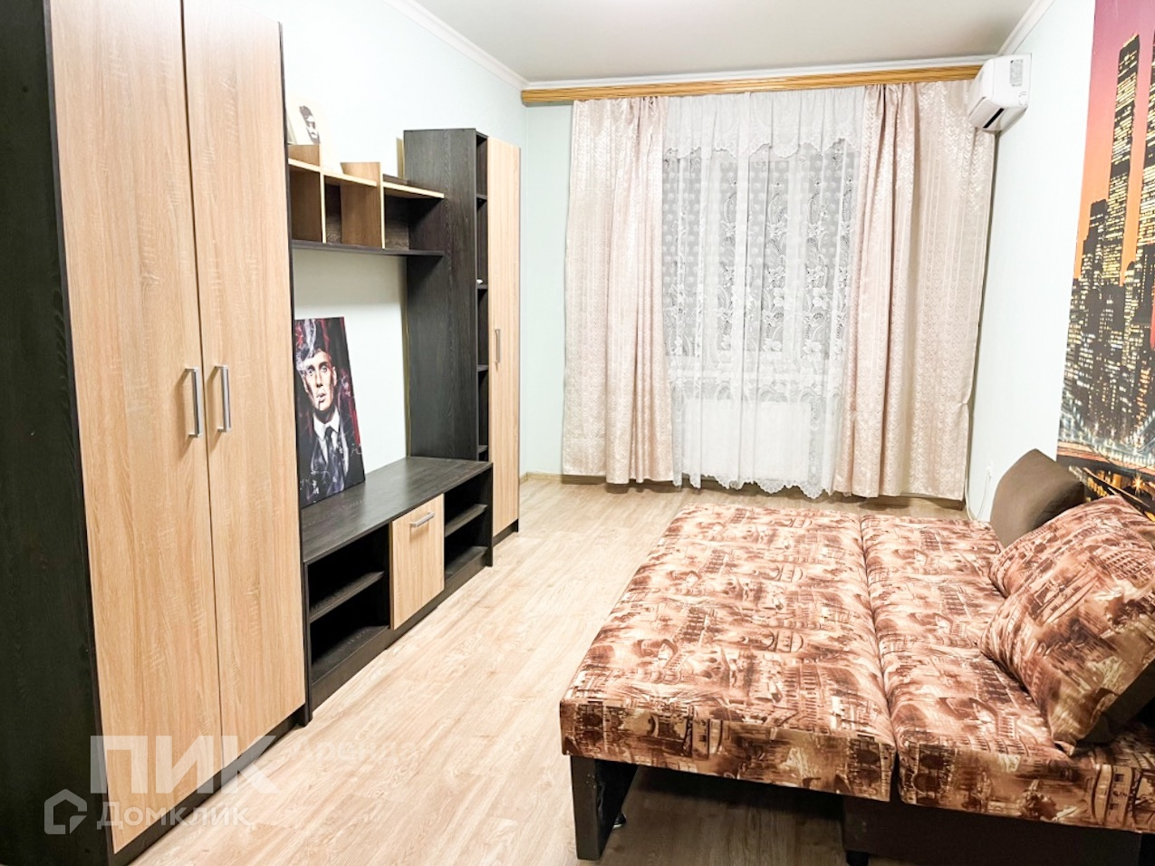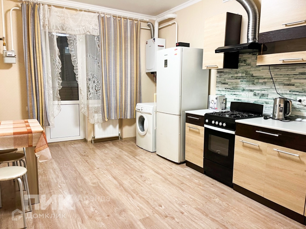 Квартира оборудована кухонным гарнитуром, мебелью и бытовой техникой. Установлен кондиционер, есть холодильник, стиральная машина, плита. Полы - плитка, ламинат и линолеум. Окна выходят во двор, на восток. Около дома бесплатная парковка.
