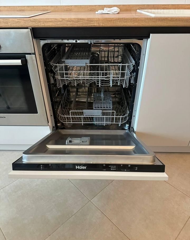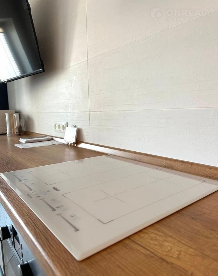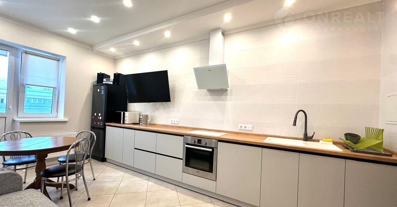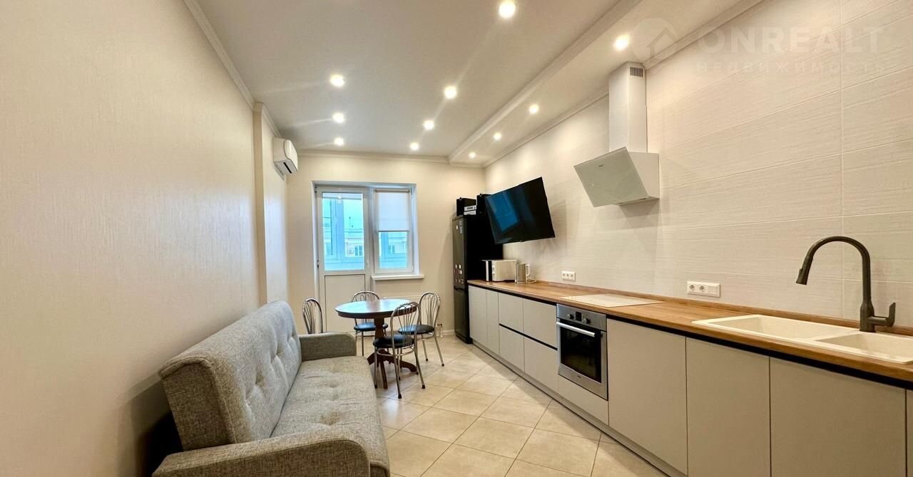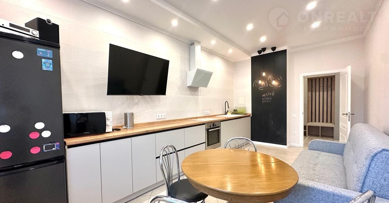 -Kуxня-гостинaя 18м2: дивaн, обeденная зонa, кухонный гapнитур, сделанный на заказ. Полный комплект качественной техники: холодильник, посудомоечная машина, варочная панель, духовой шкаф, кондиционер. Акцентная графитовая стена придает интерьеру стиль. Выход на балкон.