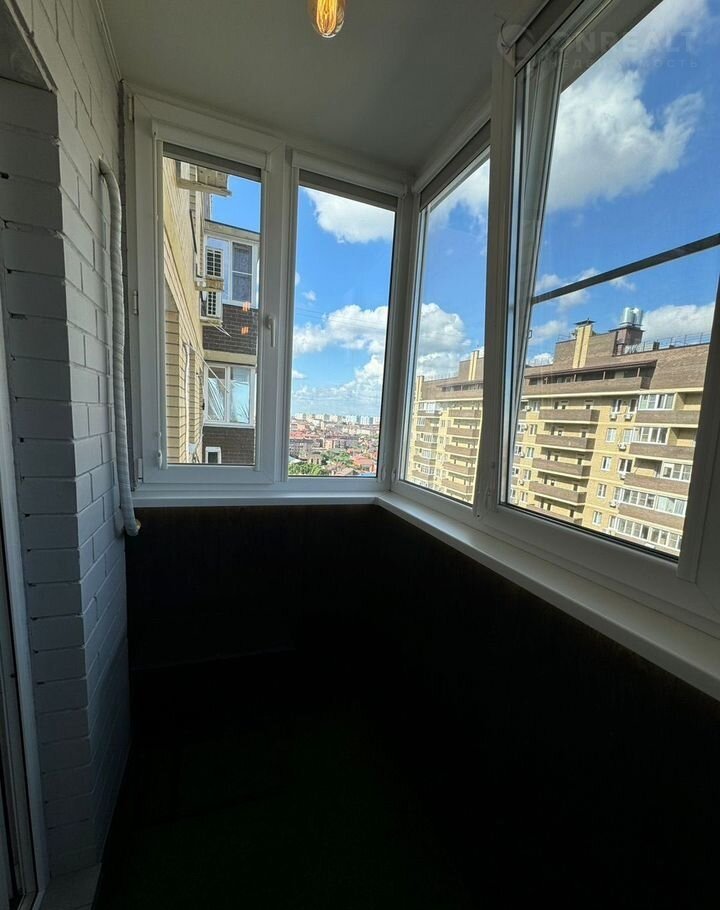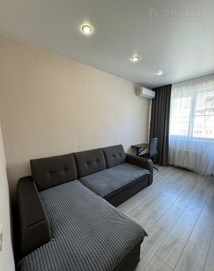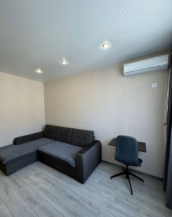 В комнате установлен кондиционер и удобный диван, а также имеется шкаф для хранения вещей. Из окон открывается вид на городские пейзажи. Лоджия застеклена и отделана плиткой, что делает ее идеальным местом для отдыха.