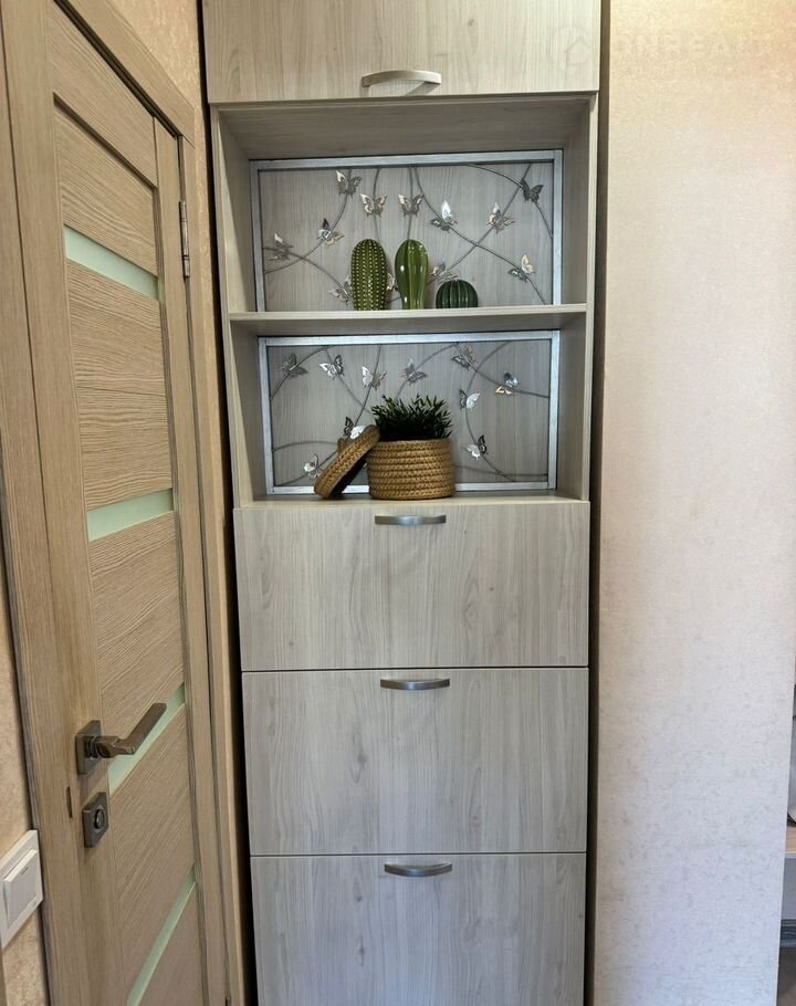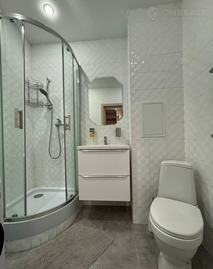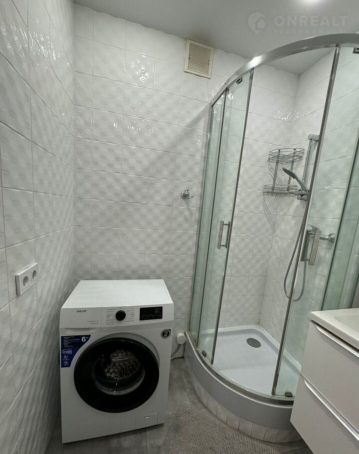 Санузел совмещенный, оснащен душевой кабиной и стиральной машиной. В прихожей предусмотрены вместительные шкафы для верхней одежды и обуви.
