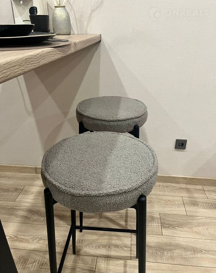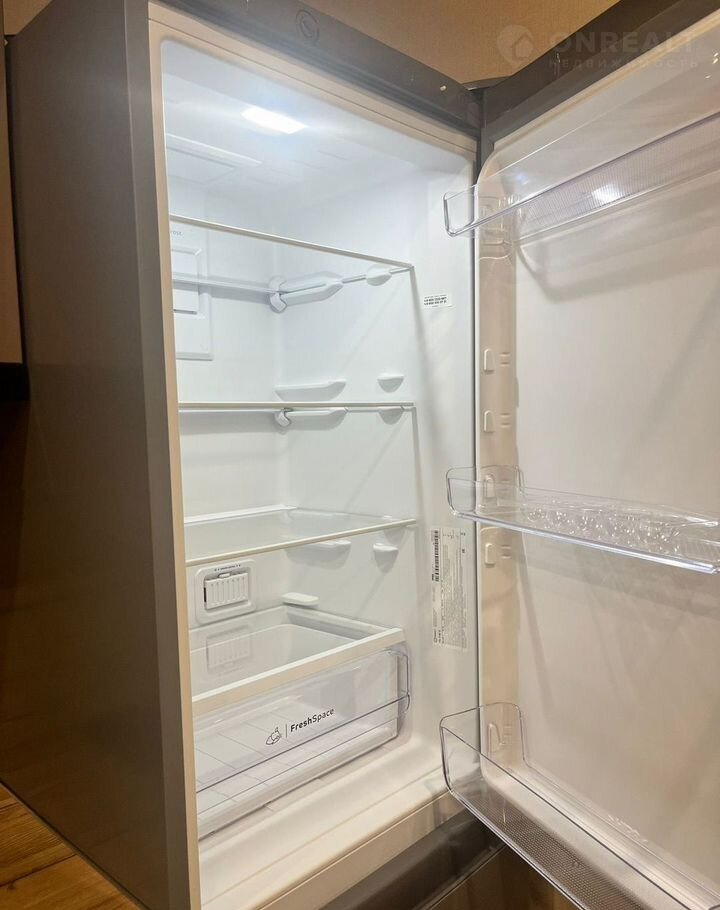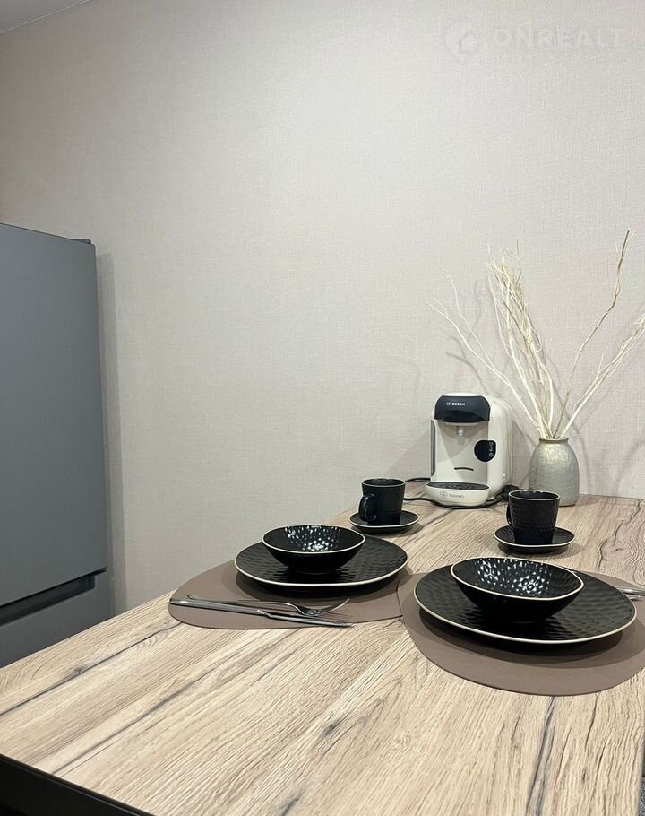 В зоне кухни  есть плита, большой холодильник с морозилкой, микроволновая печь, чайник кофемашина. Большой стол и эффектные барные стулья.