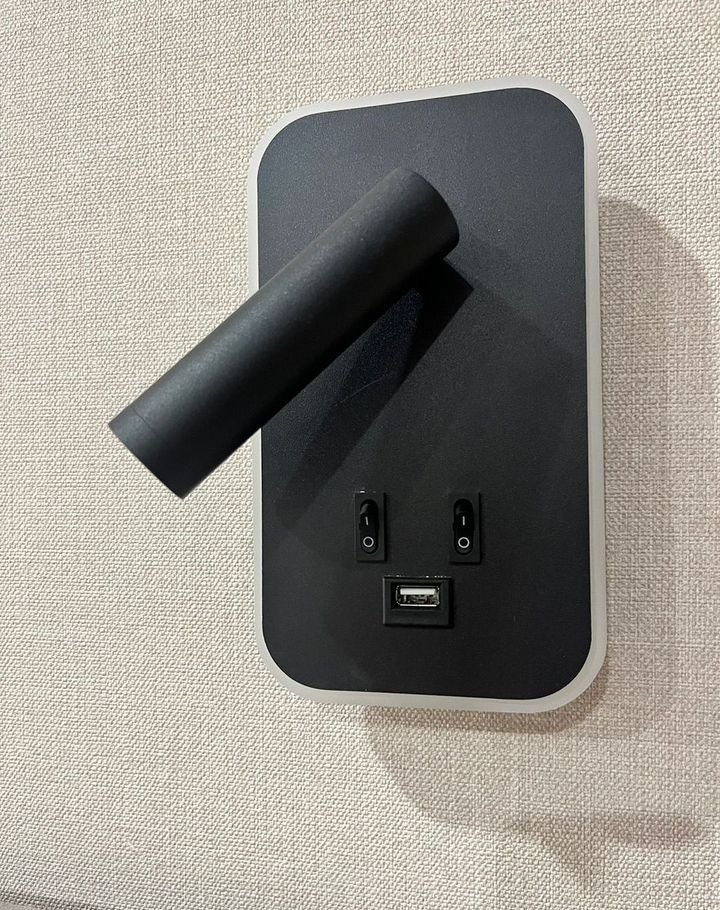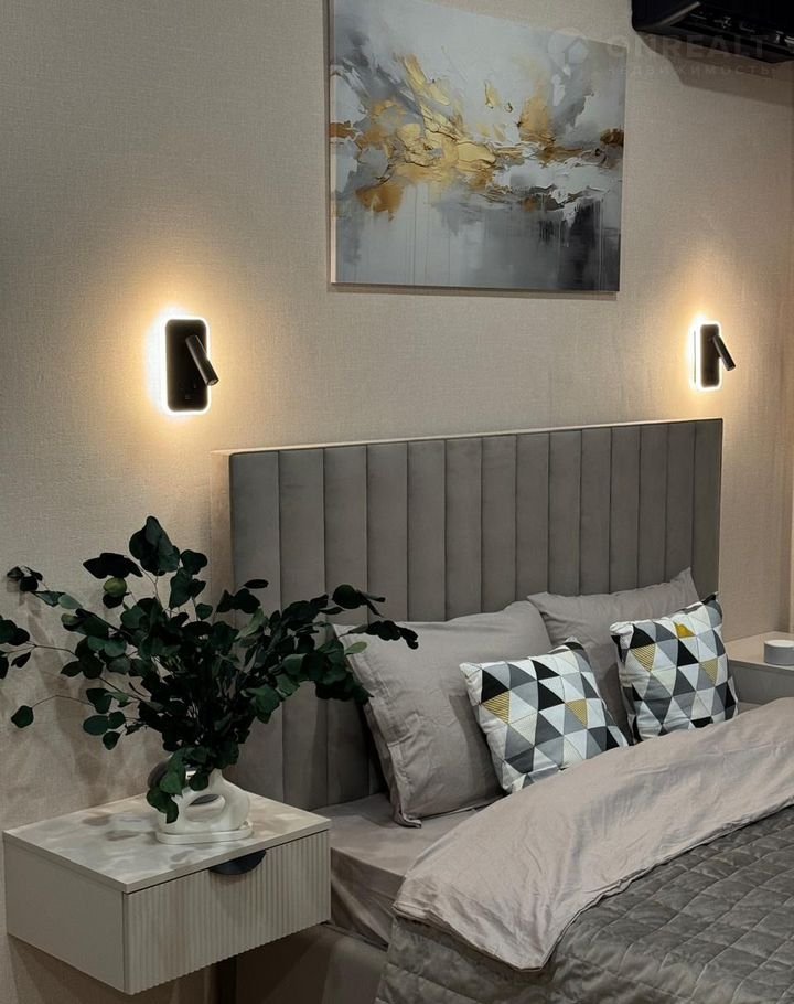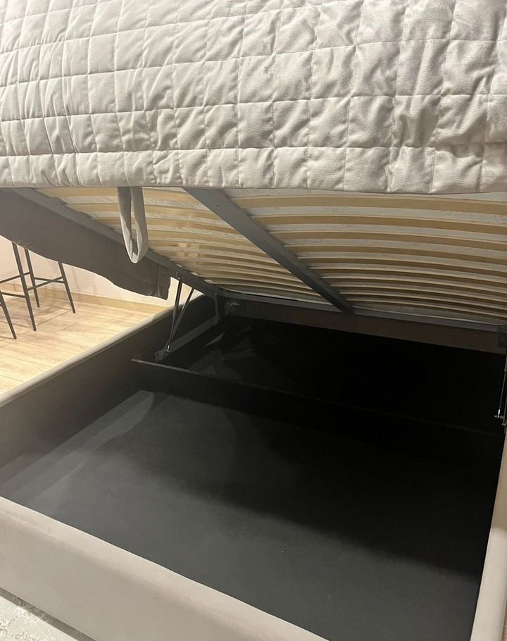 В комнате 21м2.  Кровать с высоким и мягким изголовьем и  подъемным механизмом ,ортопедический матрас.2 навесные тумбы. Светильники с розетками и двумя видами света . Телевизор , интернет . Тумба , так же с  дополнительной системой хранения.
