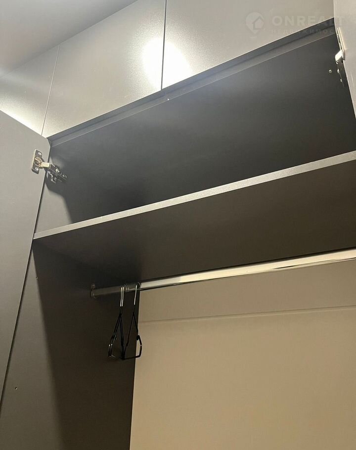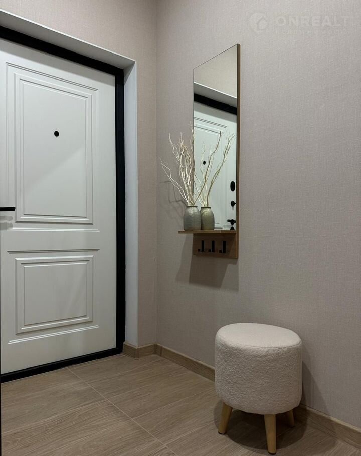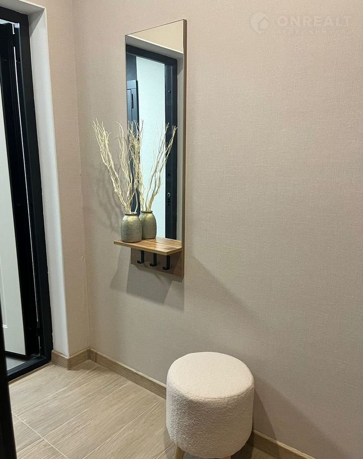 В кopидоpe 4м2 ecть шкaф с мaксимaльно удобной системой хранения и антресолями, зеркало с полкой и пуфик.