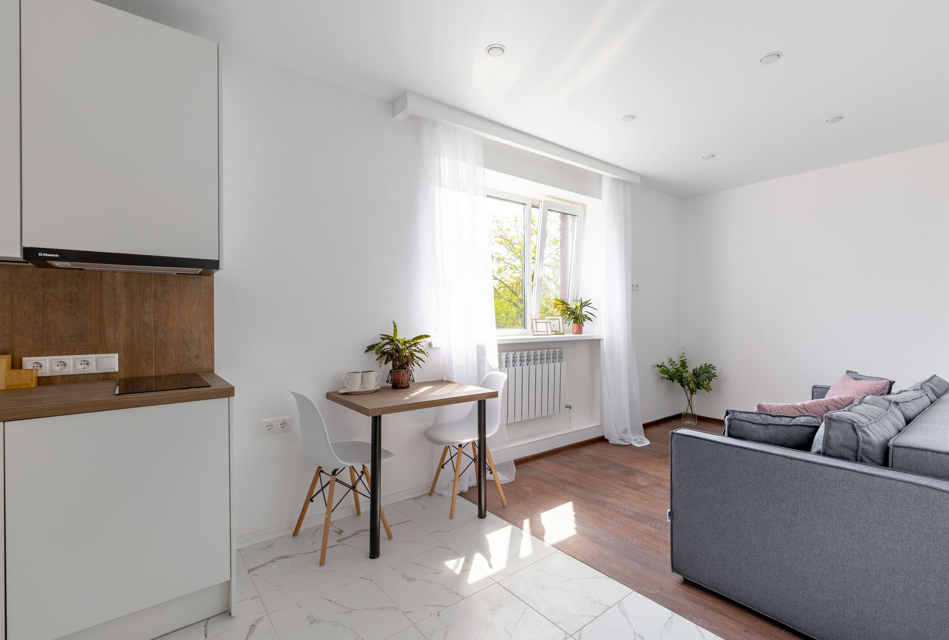 Потолки натяжные с современными скрытыми карнизами. Очень большие красивые окна Rehau с двойным остеклением и мультифункциональным напылением.