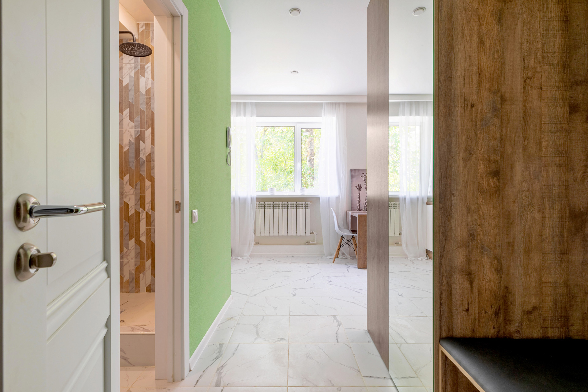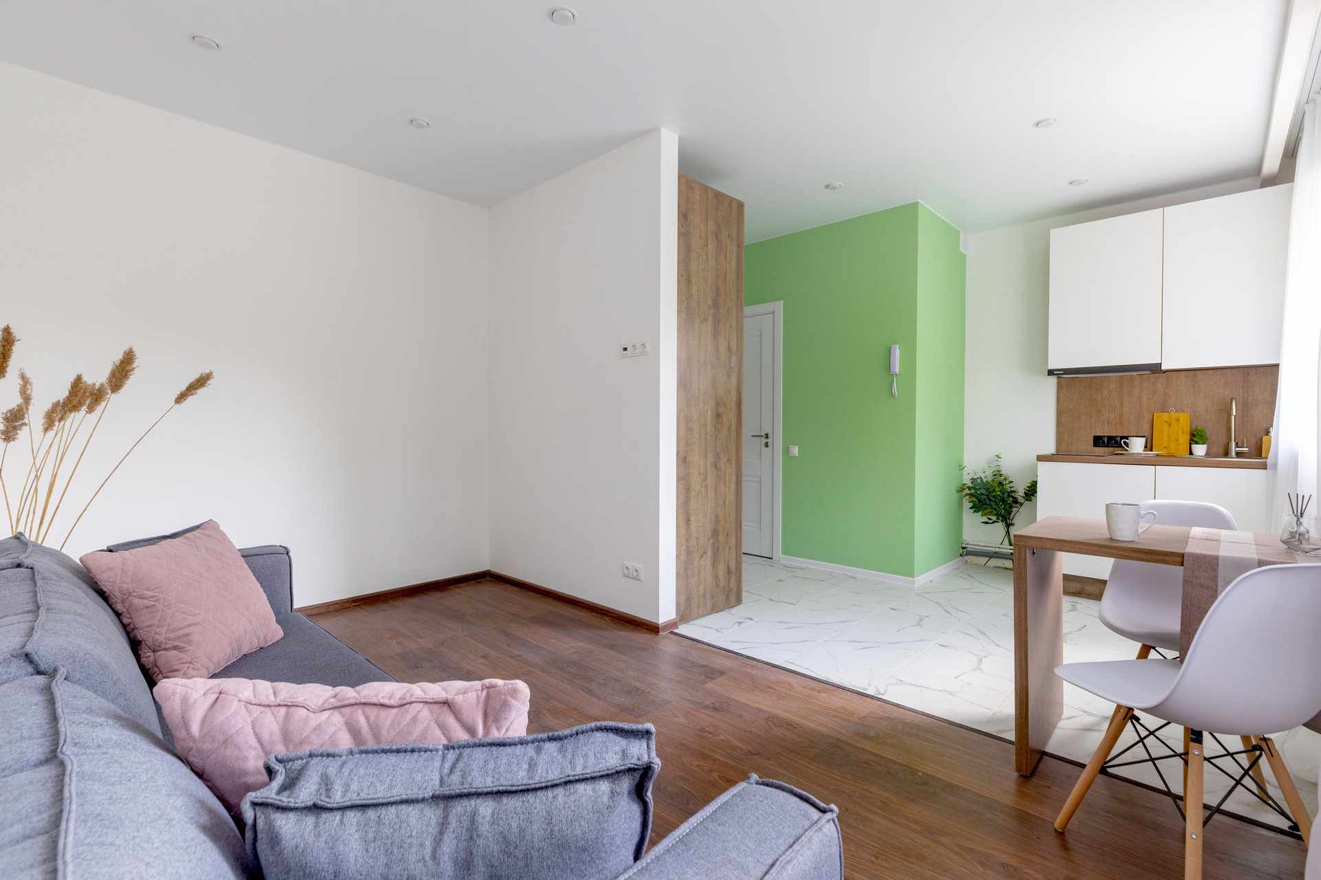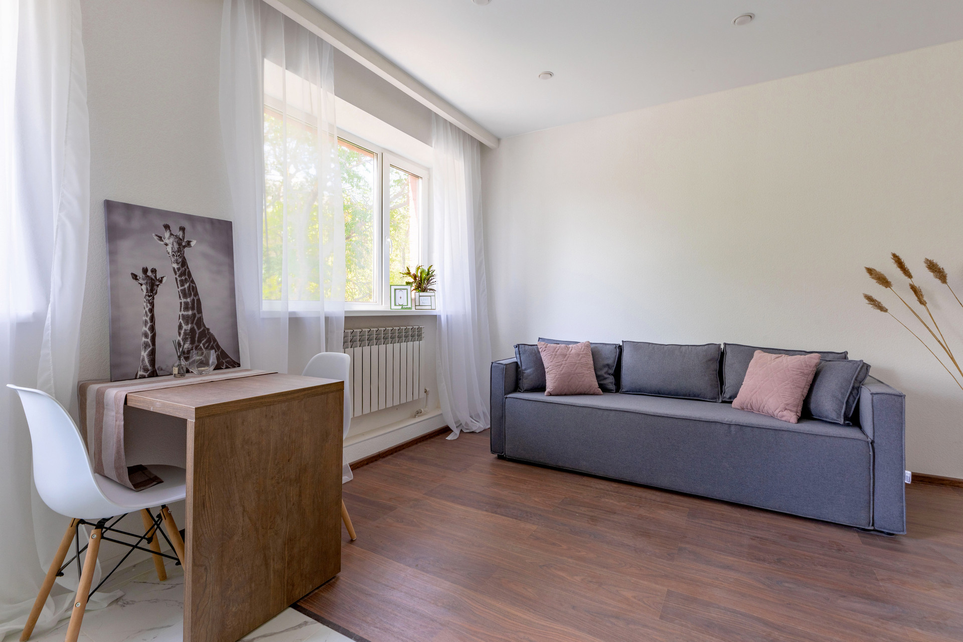 Данная студия уникальна тем, что у нее 2 больших окна которые зонируют пространство на кухню и зону отдыха, а так же наполняют ее светом