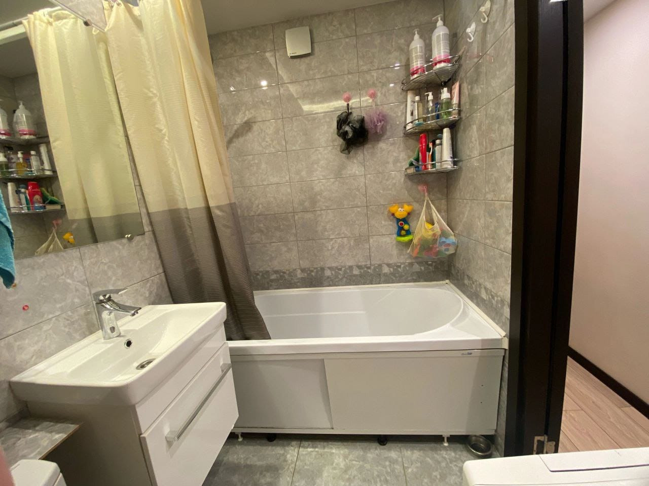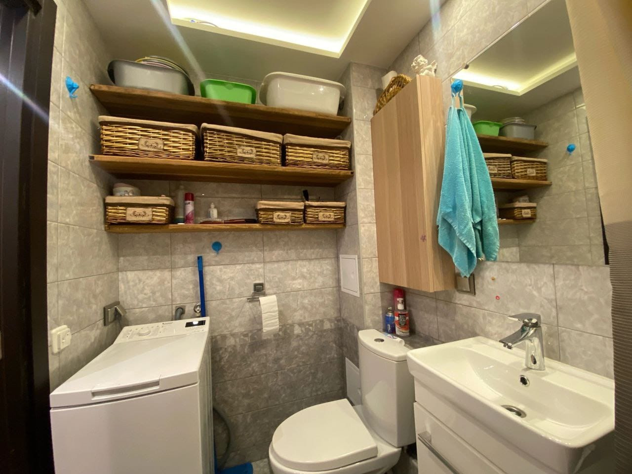 - Совместный санузел. Стены и пол выложены плиткой. Установлена тумба для хранения с зеркалом. Двухуровневый потолок с подсветкой. Вмонтирована система вентиляции с отдельной клавишей. Установлен счетчик ХВС