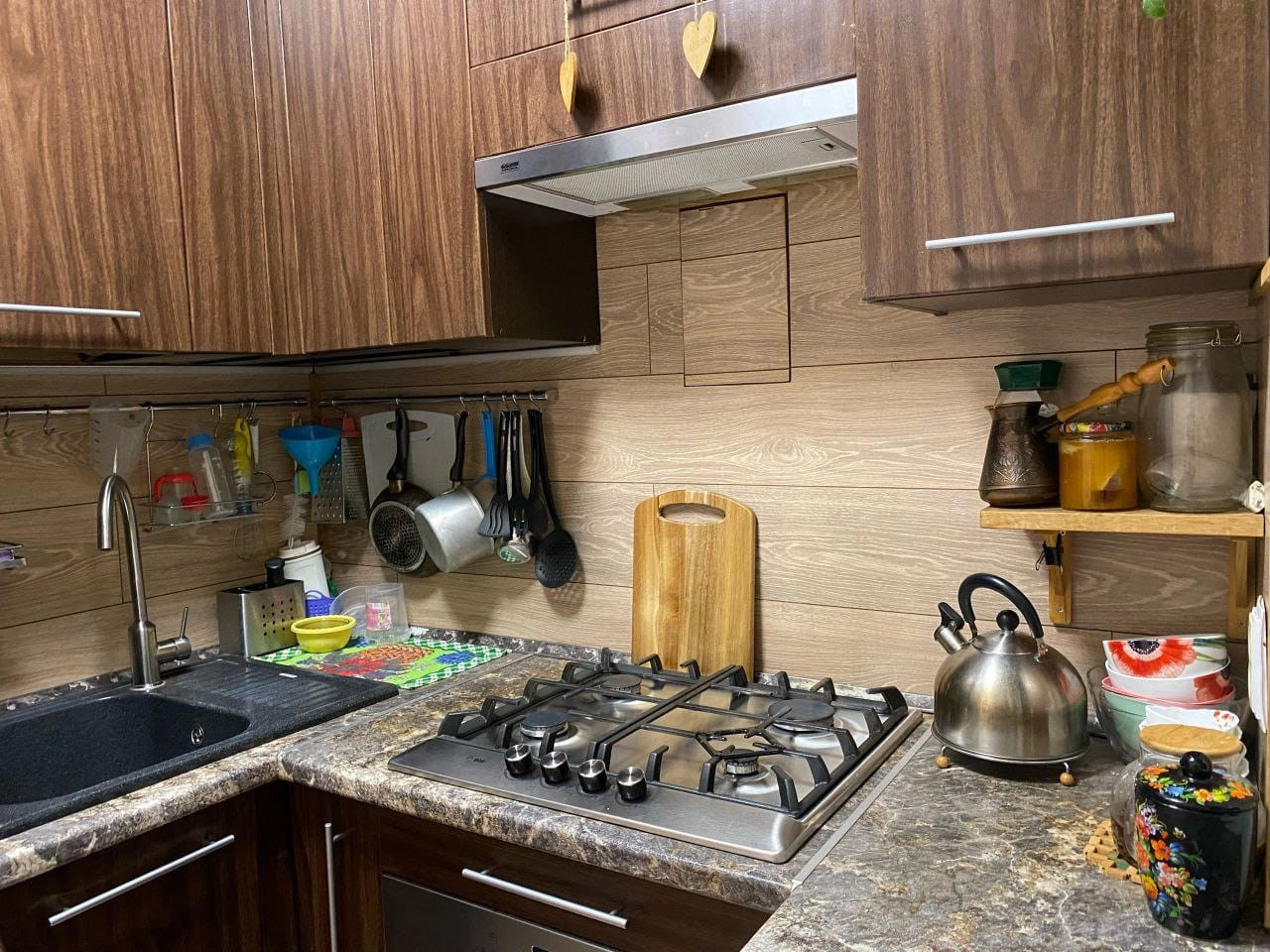 - В кухне установлена газовая колонка, зашита за стенкой, со специальным лючком. Стильный кухонный гарнитур