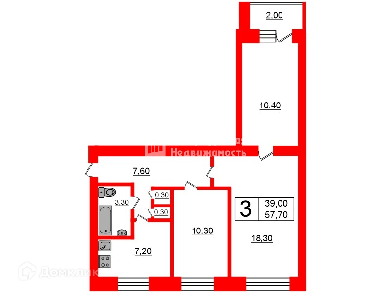 Общая площадь 57.7 м2