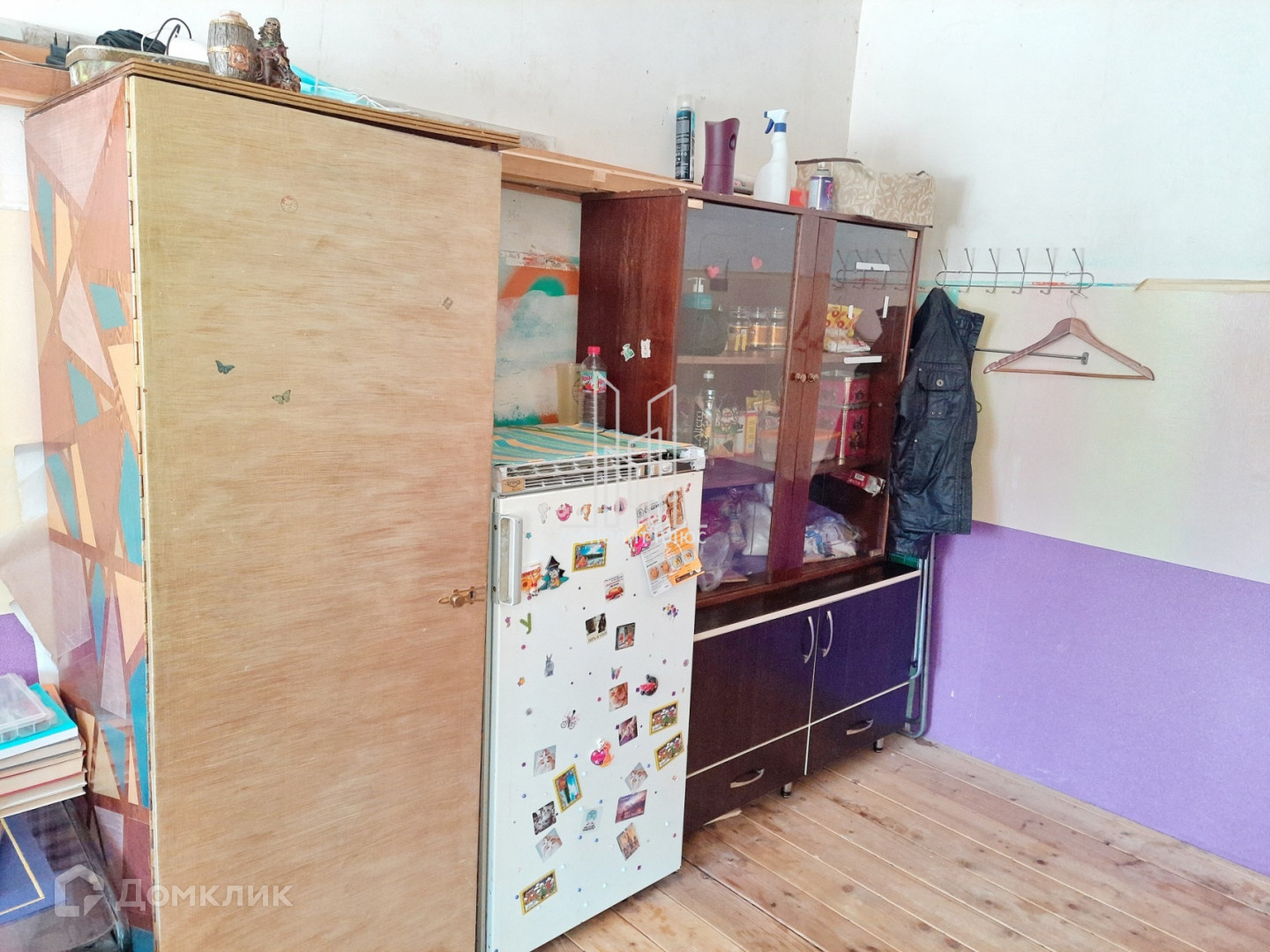 В комнате  двуспальная кровать, стол, холодильник, просторный шкаф.