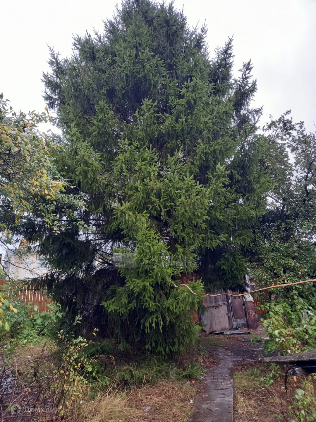 Участок прямоугольной формы 26х38 метров. На участке много фруктовых деревьев, кустарников, украшением участка является высокая пушистая ель.