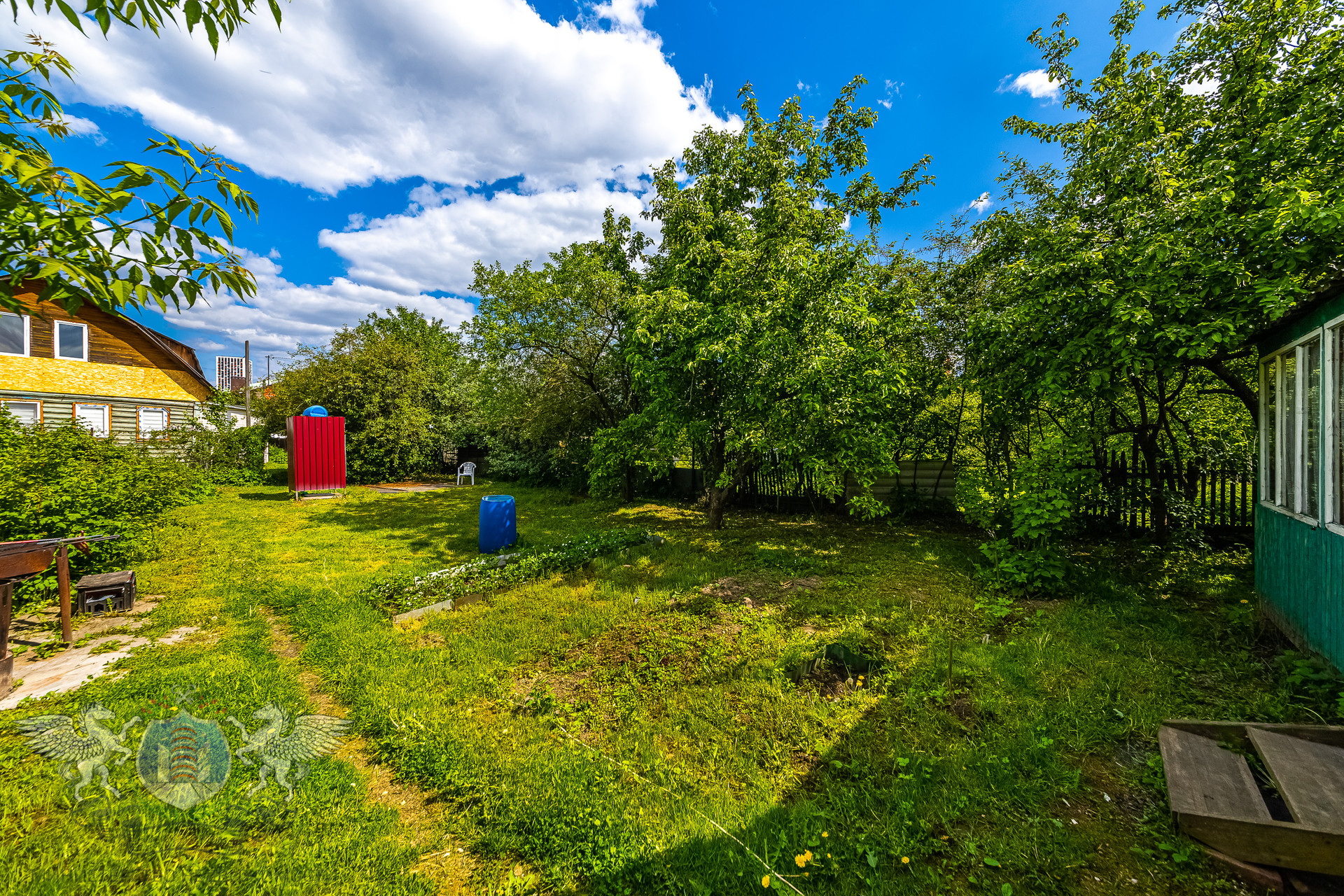 УЧАСТОК  7.4 сотки, ровный, сухой с плодовыми деревьями и кустарниками, огорожен со всех сторон. На территории есть гараж и баня. Перед участком большая площадка для парковки автомобилей.