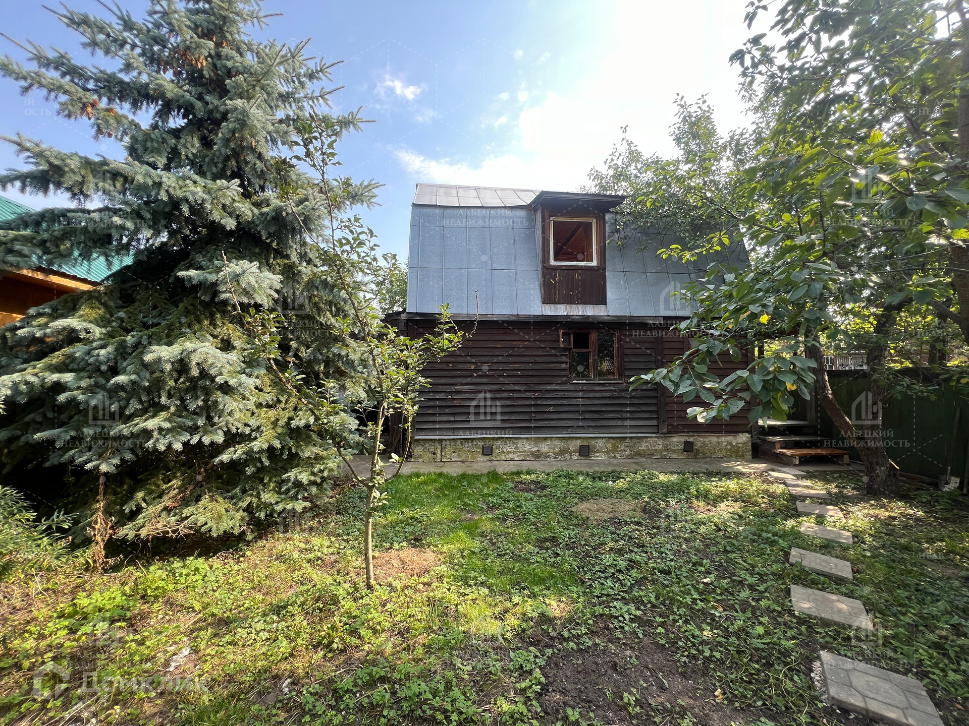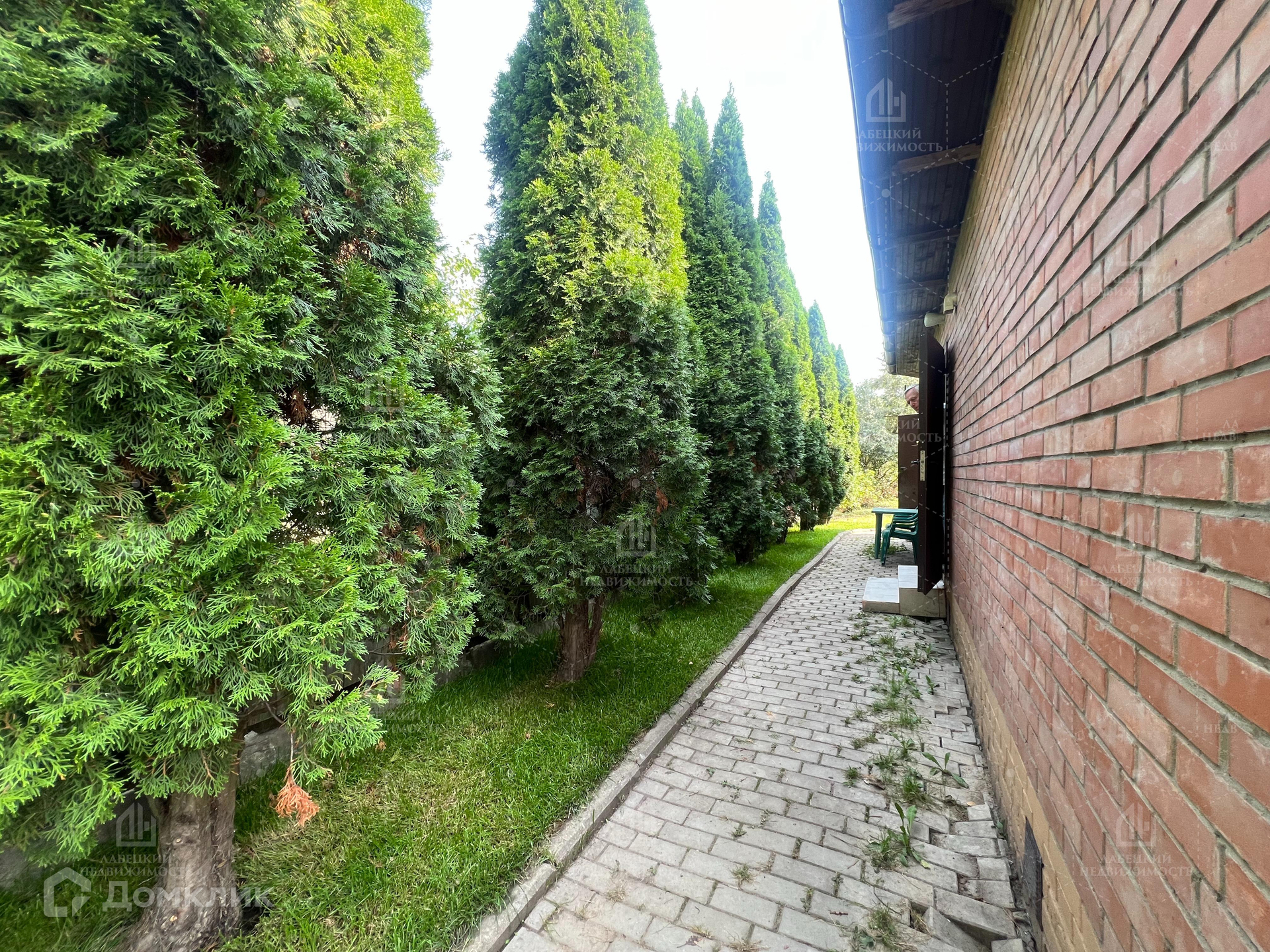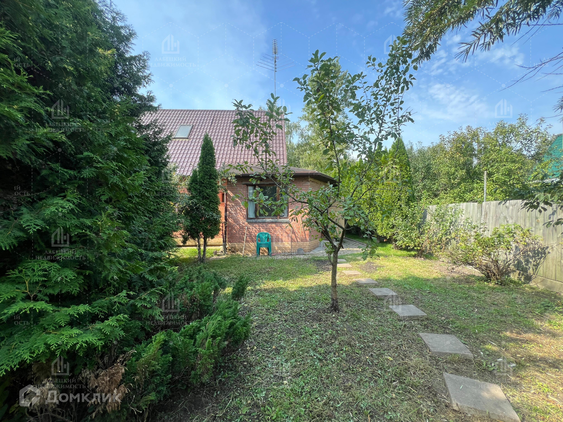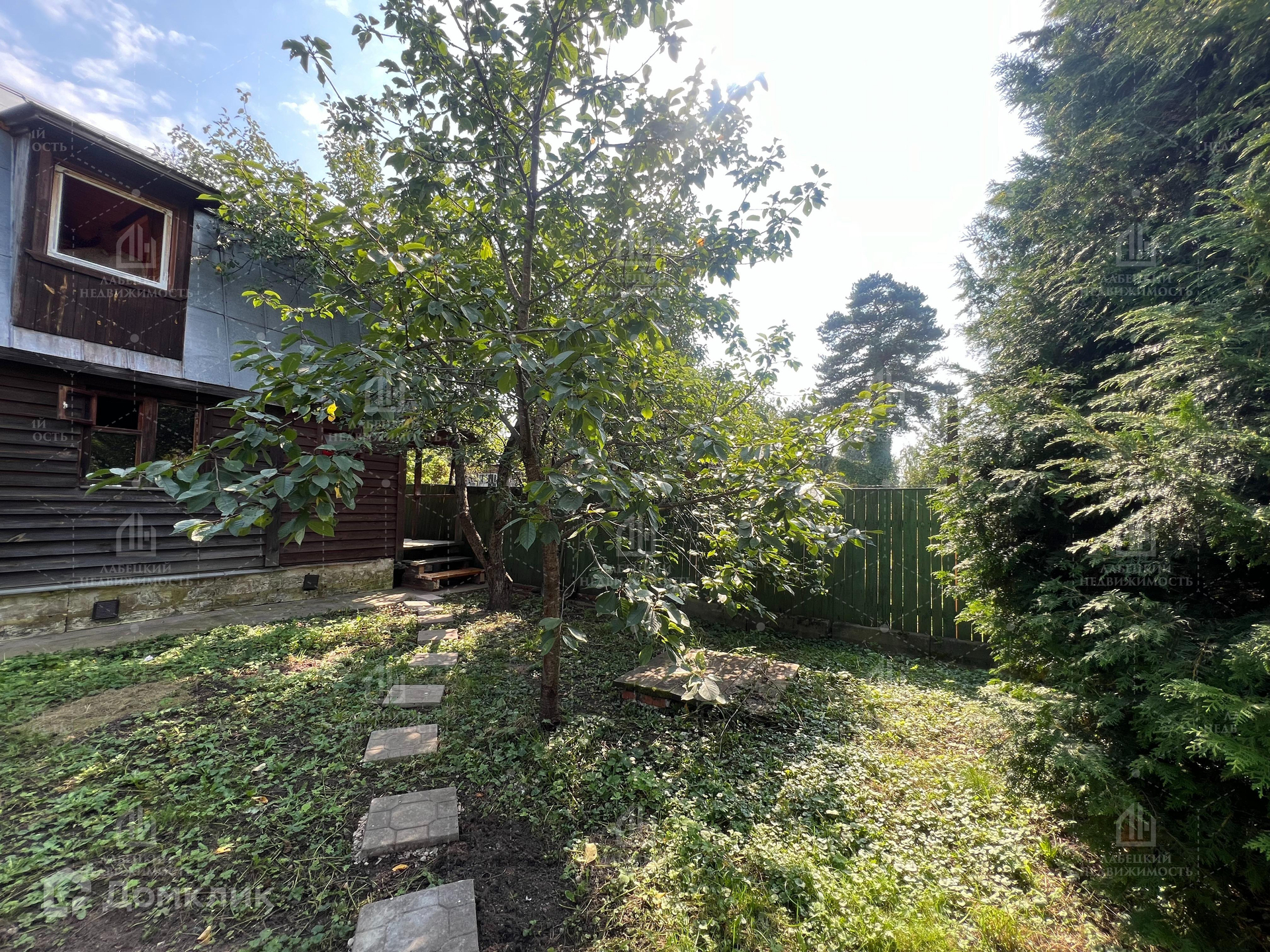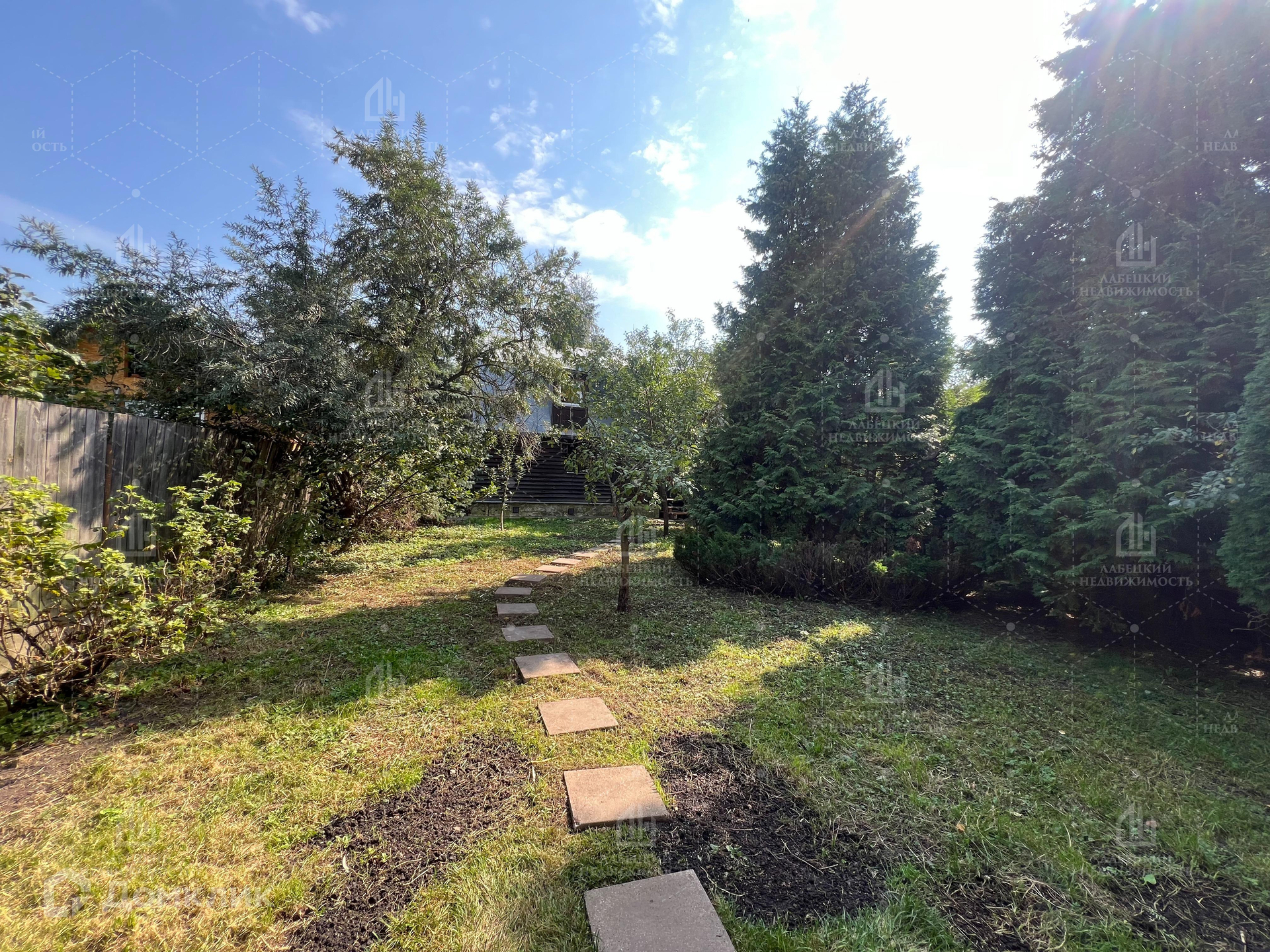 Участок ровный с большими туями и плодовыми деревьями.
