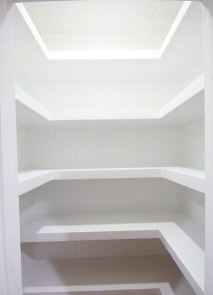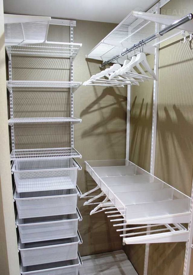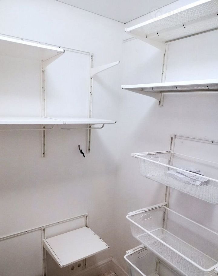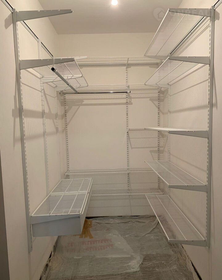 Сделан ремонт - пол плитка, стены отштукатурены окрашены, металлические полки по периметру - гардеробная система ИКЕА.