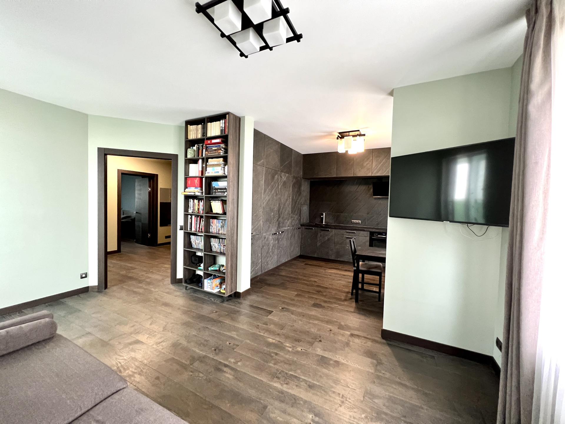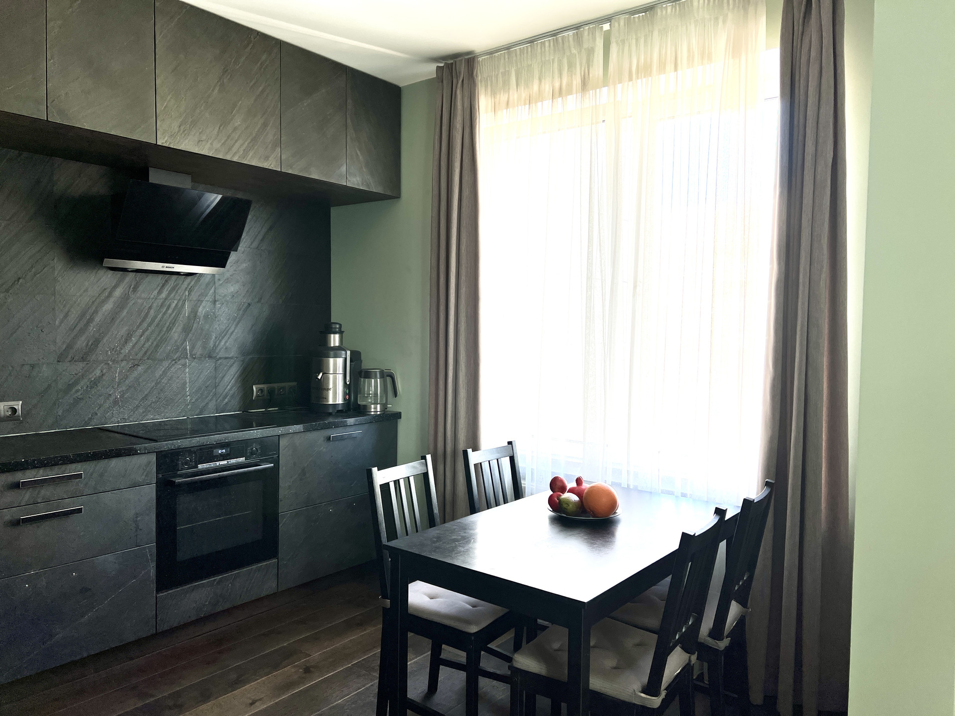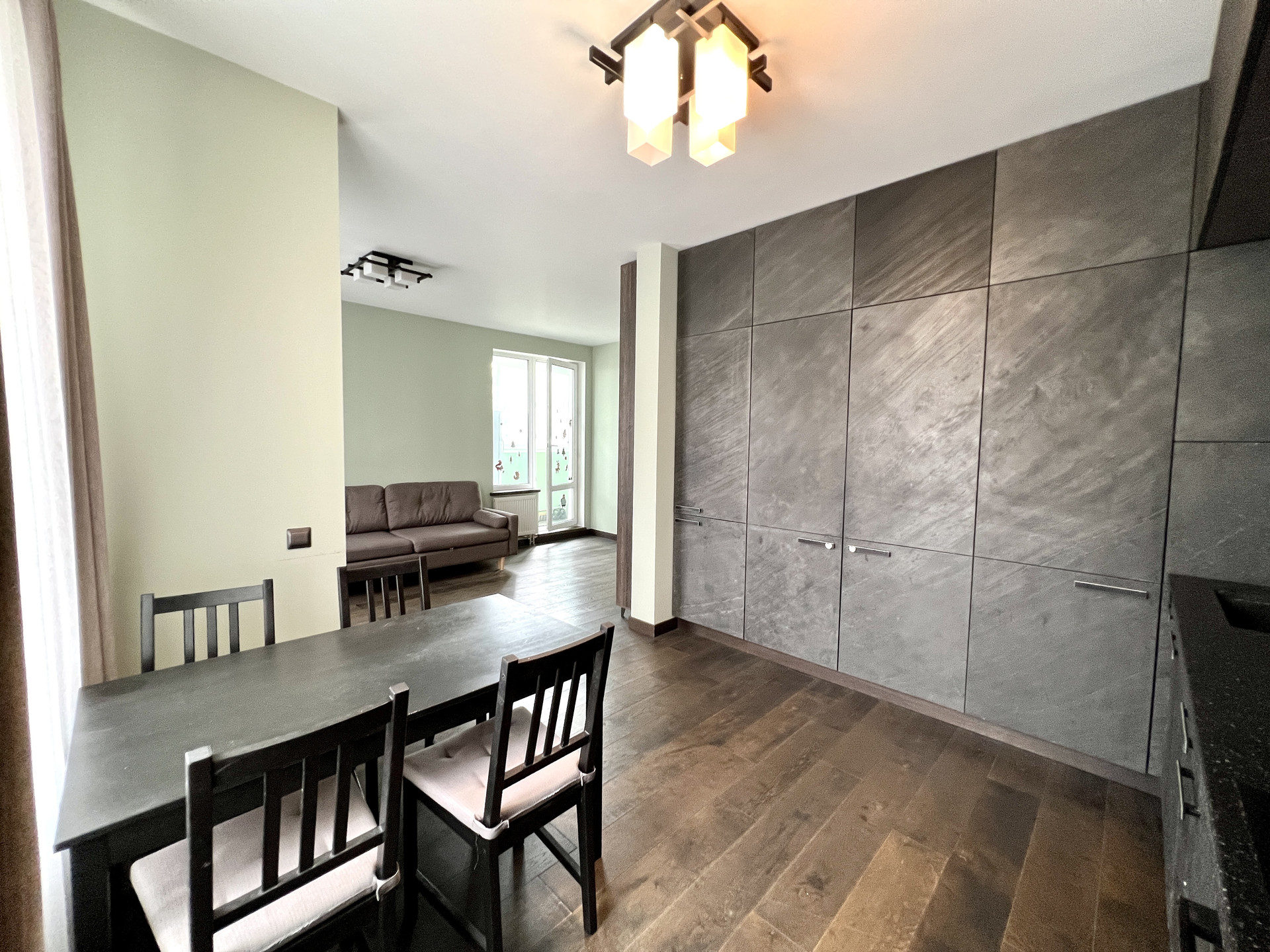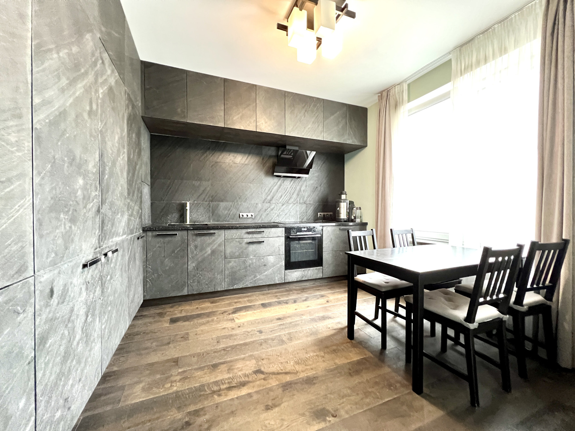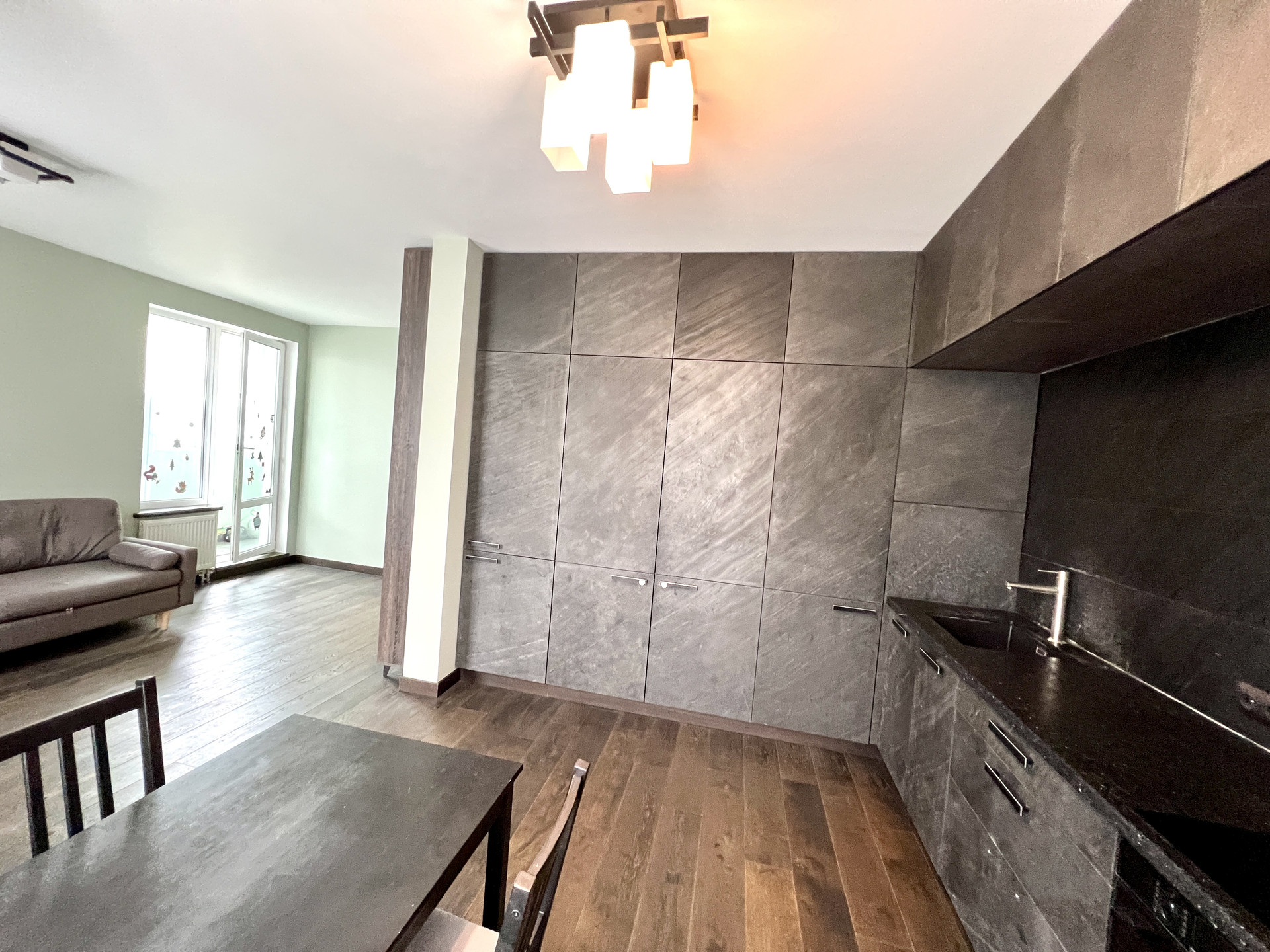 Кухня/гостиная: кухня 11,7 кв.м.. объединена с комнатой 15,0 кв.м. с выходом на лоджию 6,1 кв.м.. Кухонный гарнитур угловой, фасады, каменный шпон, сплошные под потолок, очень много места для хранения. Столешница искусственный камень, кварц.