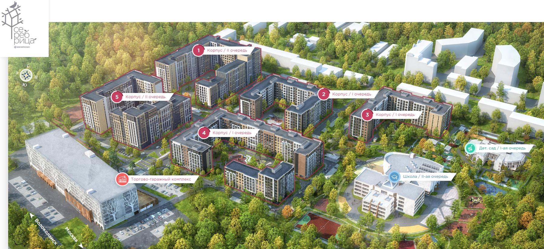 Корпуса второй очереди введены в эксплуатацию в 2022г. и представляют собой 8-10-12 этажные здания, первый корпус на 561 квартиру, пятый – на 513 квартир. В домах второй очереди представлены на выбор 38 типов планировок квартир с отделкой и без отделки: от эргономичной студии до просторной четырёхкомнатной с гардеробной и двумя санузлами. Всего в составе миниполиса Серебрица 5 жилых корпусов высотностью 8-12 этажей. Входные группы жилого комплекса оснащены витринным остеклением. Подъезды расположены на уровне земли, без ступенек и порогов. На -1 этаже в каждом корпусе устроены кладовые. Во всех домах миниполиса установлены лифты марки KONE.