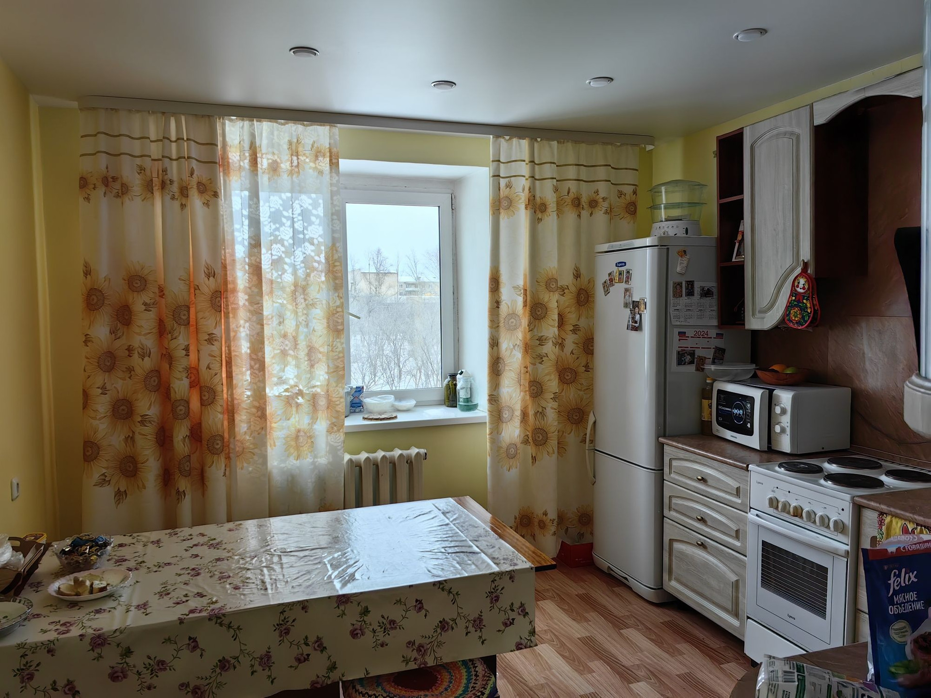 Очень светлая квартира, окна выходят на 3 стороны, окна пластиковые , большой застеклённый балкон, 2 санузла, кухня 11 кв.м.