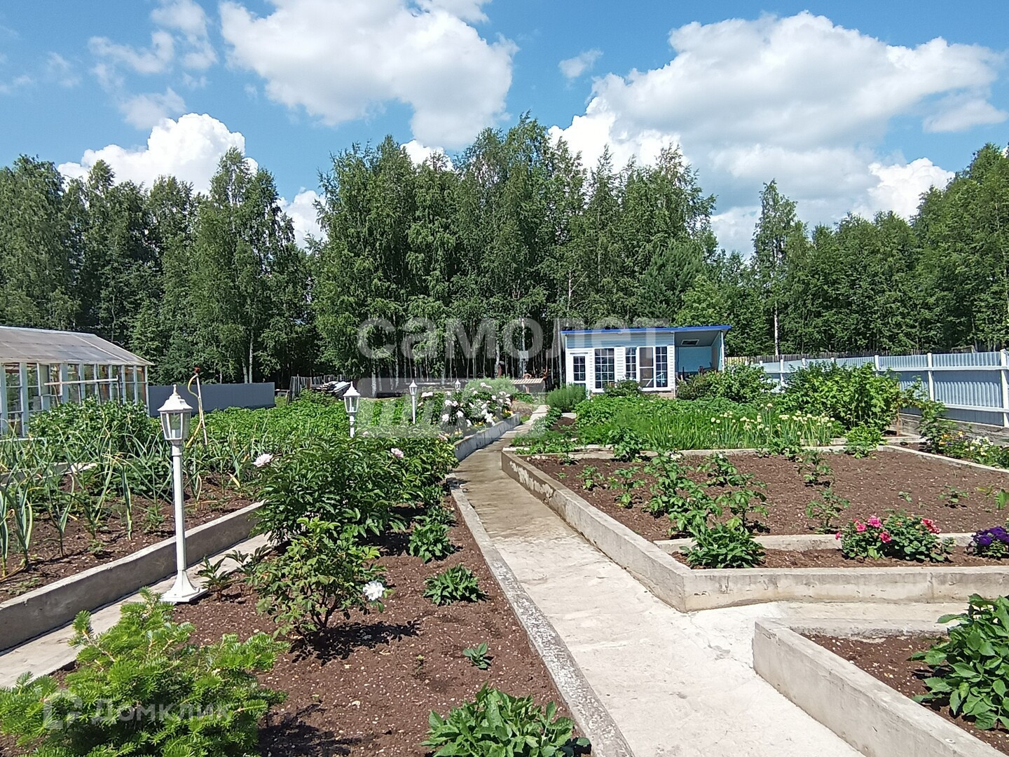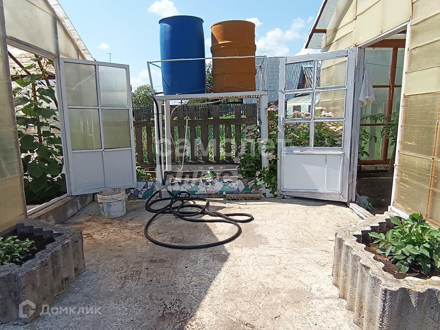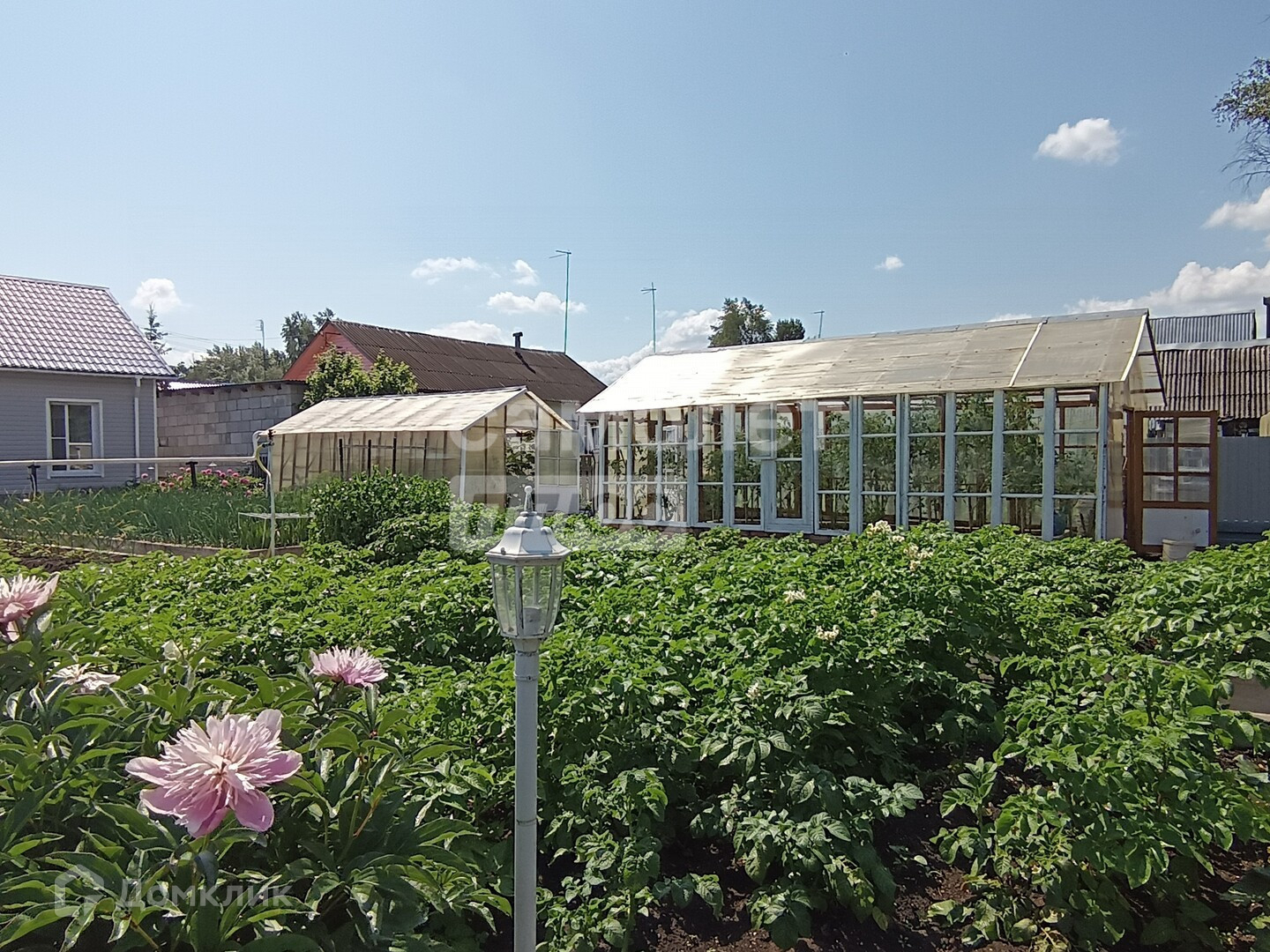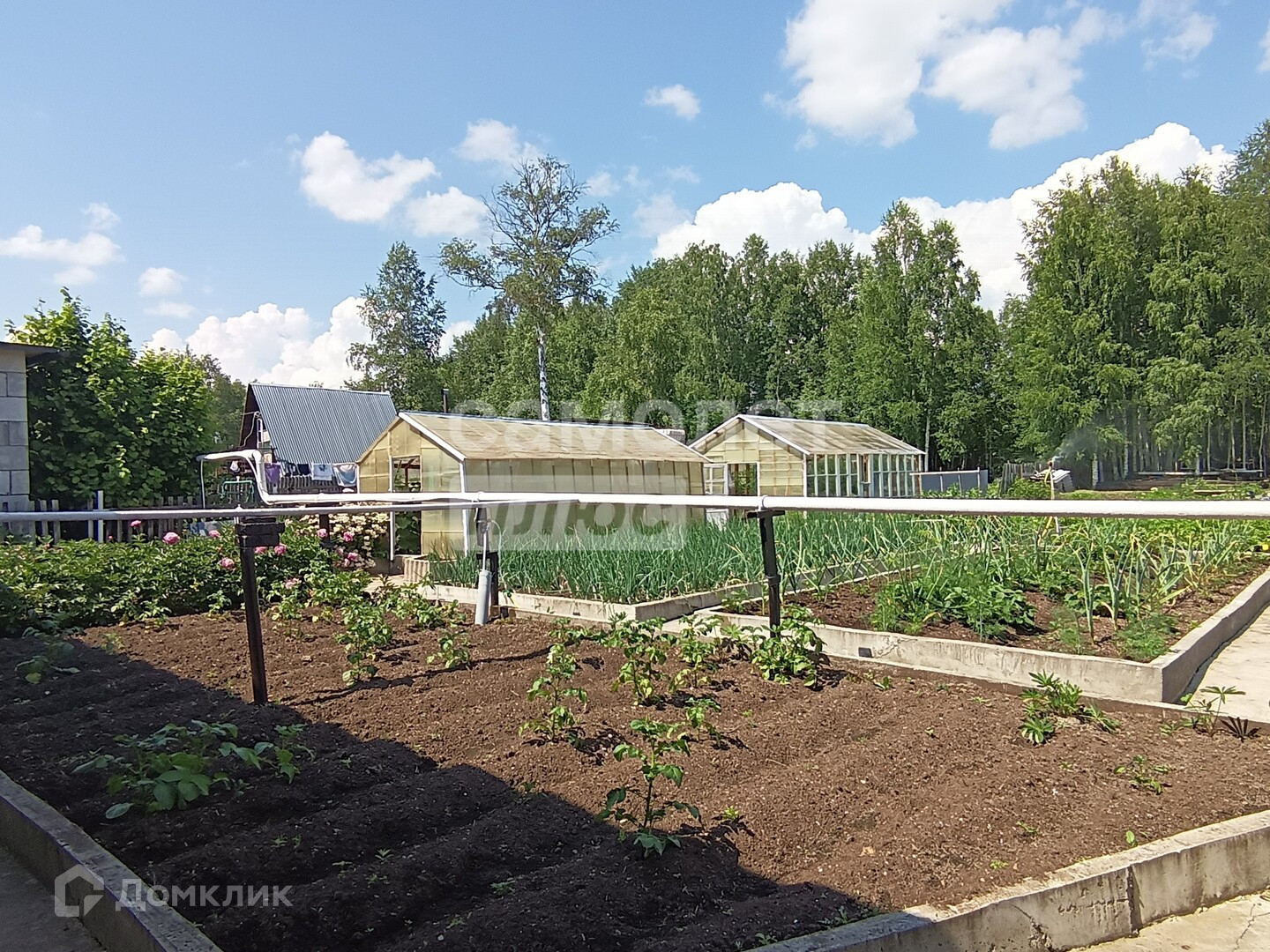 На участке оборудованы: зона отдыха, две сварные теплицы на бетонном основании (одна из алюминия), система полива, освещение, зона отдыха рядом с домом, отдельно на участке оборудована сушилка для белья в домике с кладовкой (может использоваться как беседка)