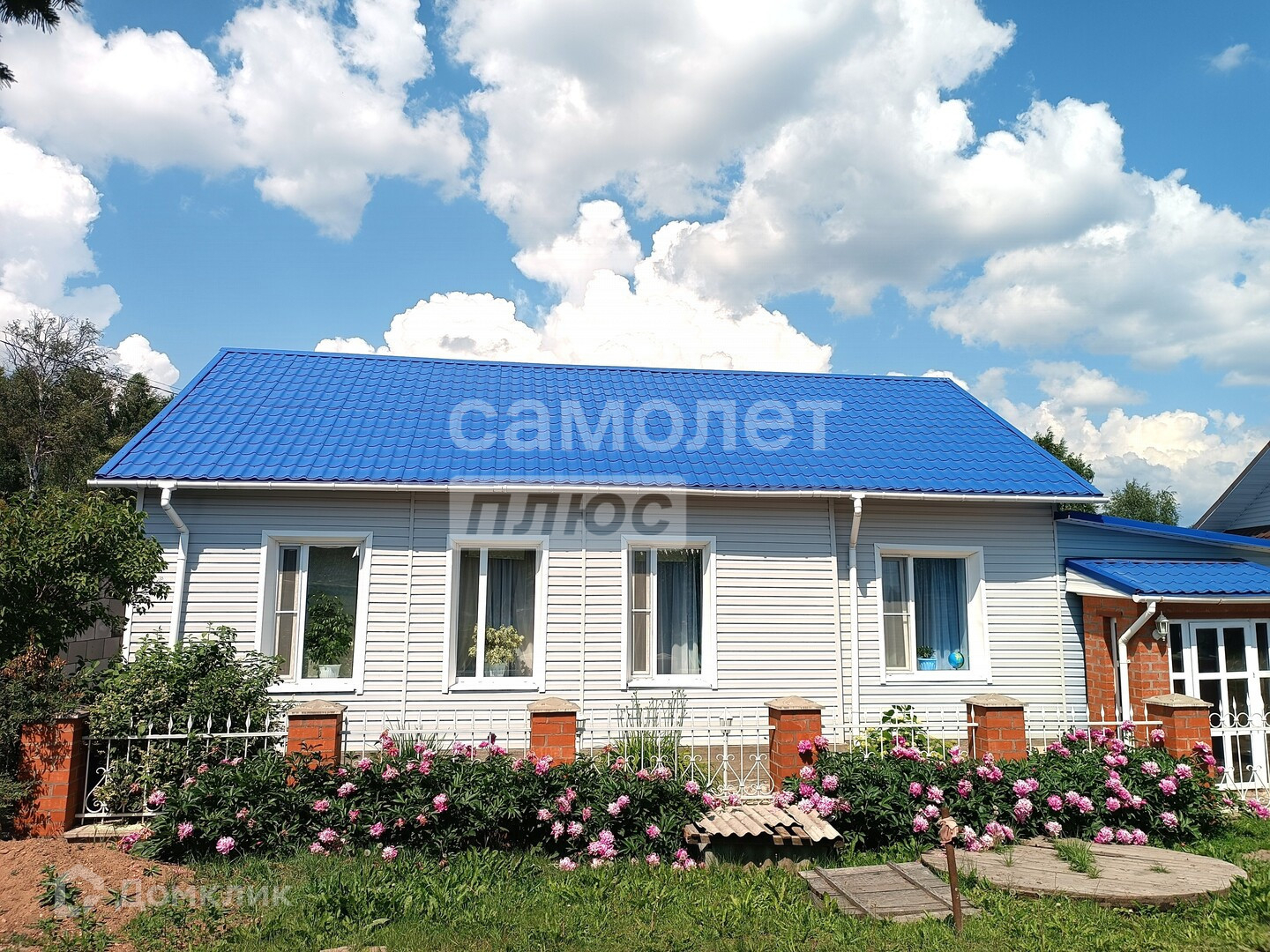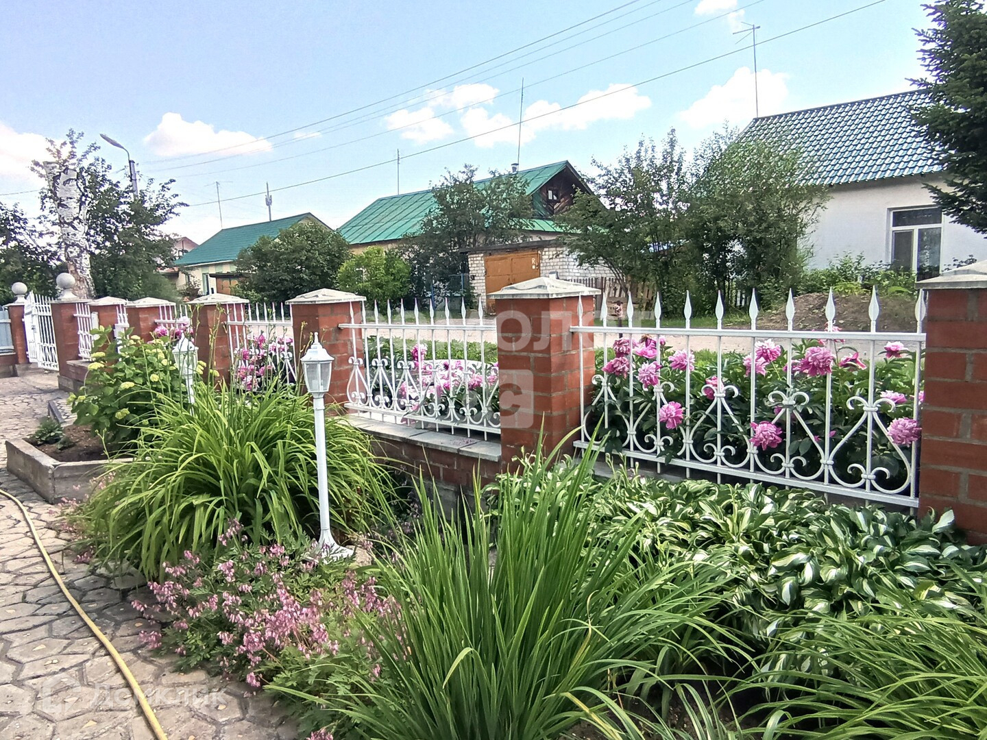 Участок ровный и сухой, со стороны фасада огорожен окрашенным кованным забором на кирпичном основании (с калиткой и воротами), с других сторон участка ограждение металлопрофилем.