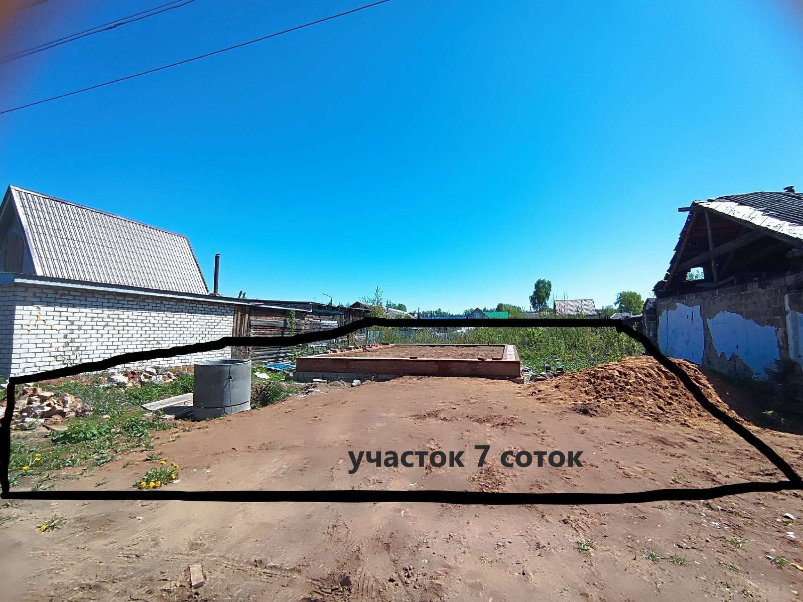 Продается на Матросово готовый участок для строительства своего дома мечты.  Участок с готовым фундаментом. Под фундаментом засыпано несколько машин  с песком и щебнем. Фундамент плита. На участке вода в глубоком колодце. Электричество заведено на 220. Счетчик на столбе. Есть условие продажи! Показываем по договоренности.