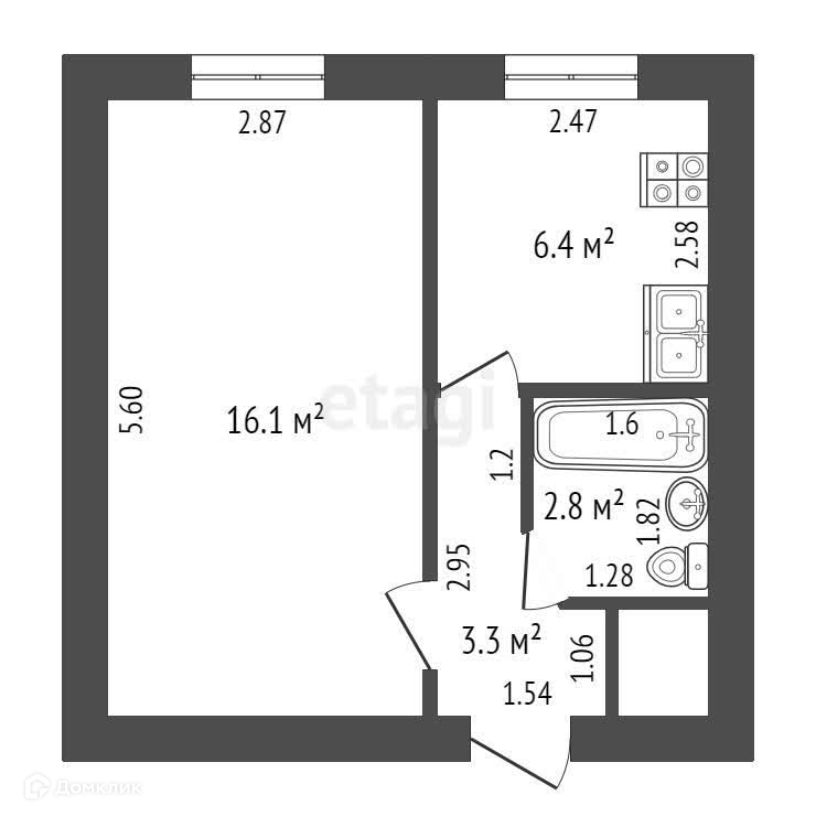 Общая площадь квартиры 29 кв.м., жилая 16 кв.м., кухня 6 кв.м.