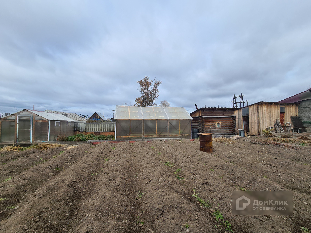 Разработанный участок земли под посадки, на котором 2 теплицы и баня.