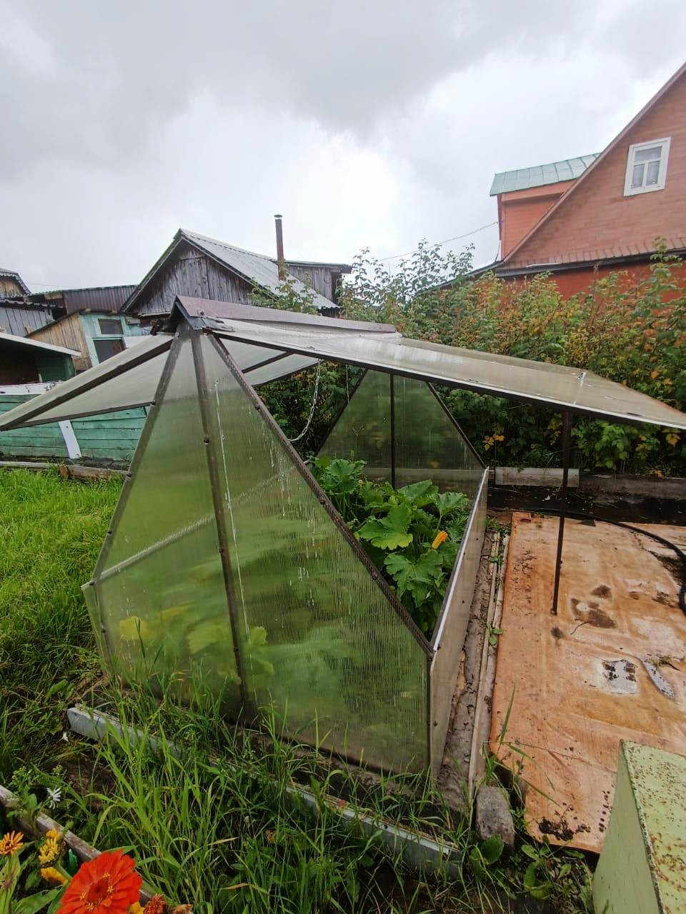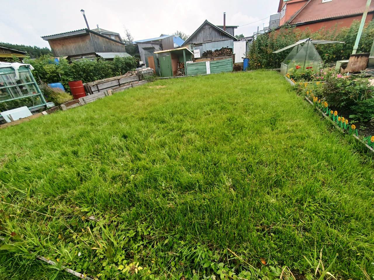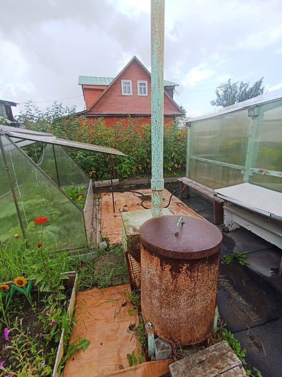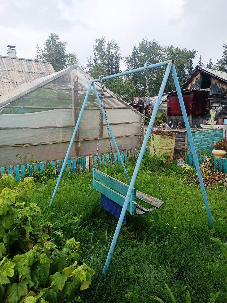 На участке домик, теплица, парник, сарай для инвентаря, качели, стоянка для машины.