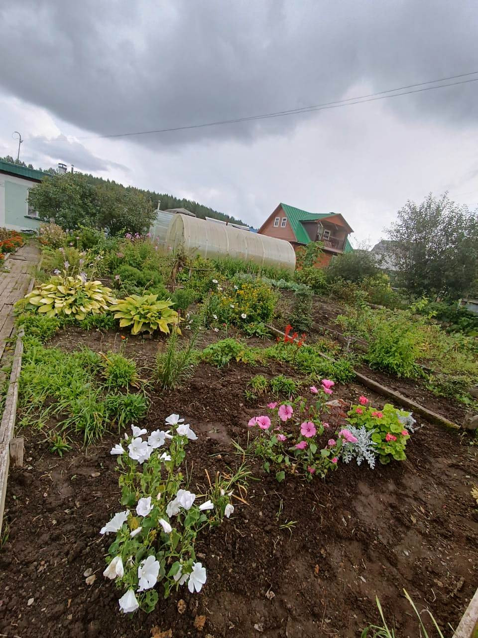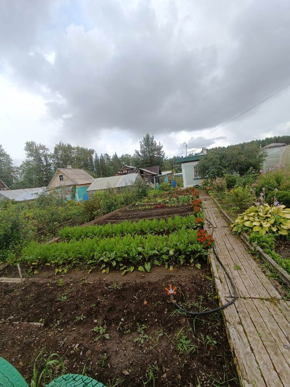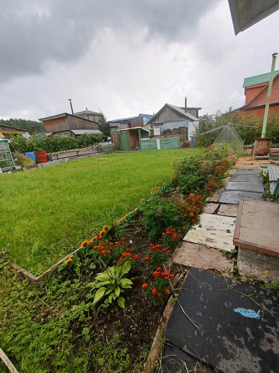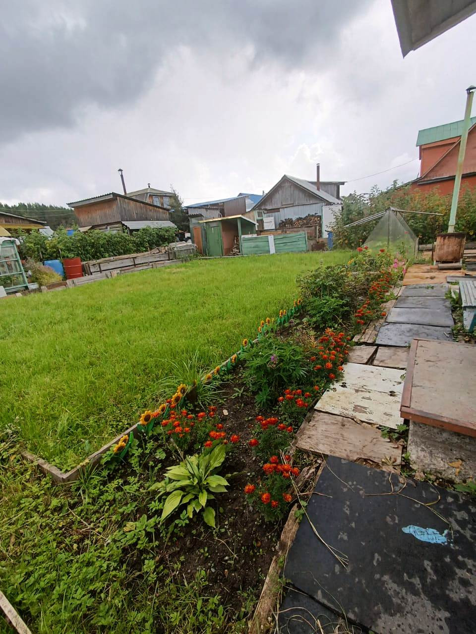 На участке домик, теплица, парник, сарай для инвентаря, качели, стоянка для машины.