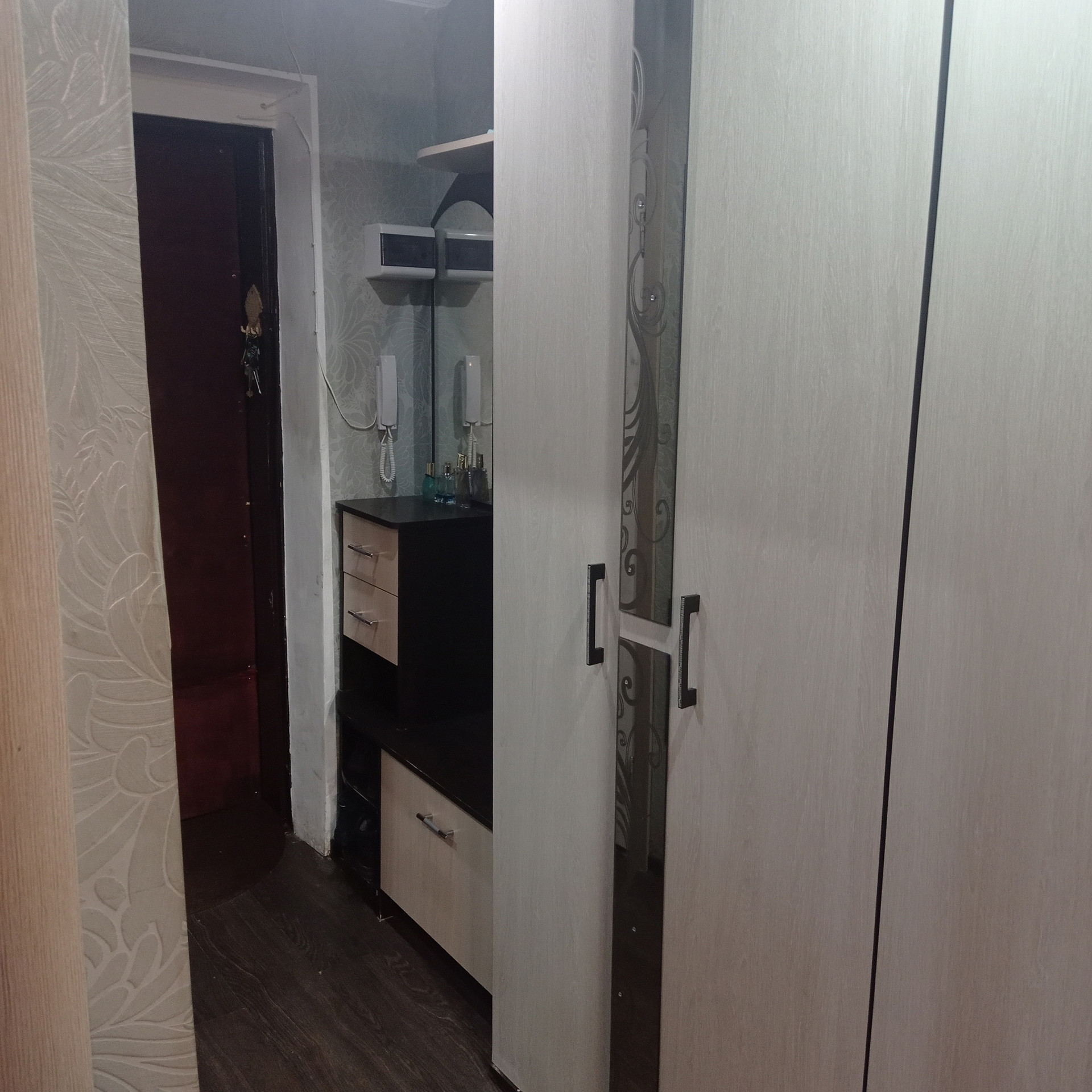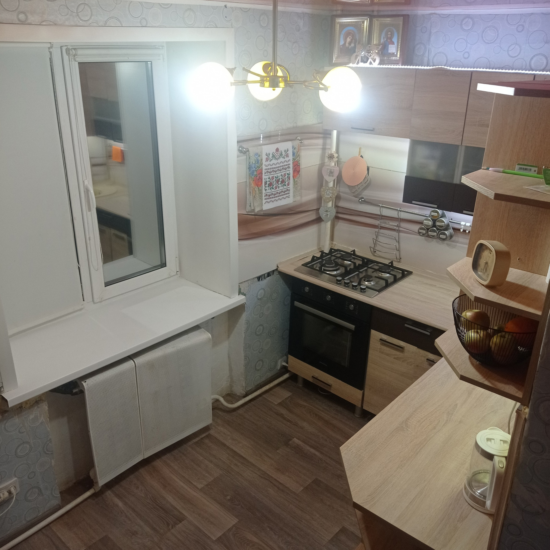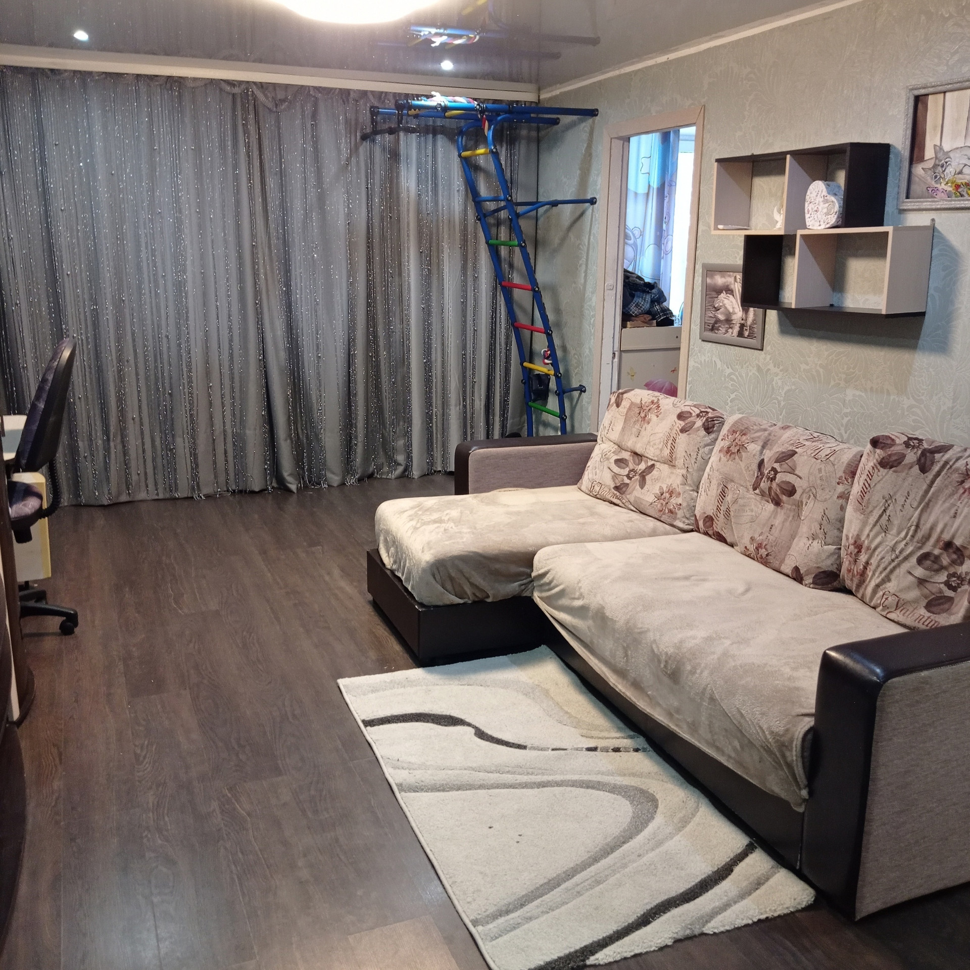 Продам благоустроенную квартиру, полутора комнатную, 1 этаж. В квартире есть косметический ремонт, заменена сантехника (отличное давление холодной воды), счётчик на воду, газ. Раздельный санузел, кухонный гарнитур, встроенная газовая колонка, стиральная машина, гостиная стенка со шкафами под телевизор с двумя платяными шкафами, встроенный подиум-кровать (всё, что нужно для комфортного проживания). В квартире имеется застеклённый балкон, два окна ПВХ (кухня, спальня). В гостиной, в спальне постелен ламинат, натяжные потолки в гостиной и кухне. В квартире тепло зимой, прохладно летом. Имеется домофон, снег чистят регулярно, напротив окна кухни открытая парковка.