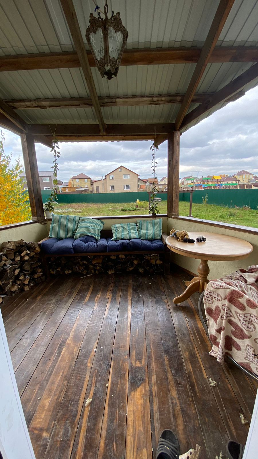 Удобная терасса с видом на участок правильной геометрической формой.